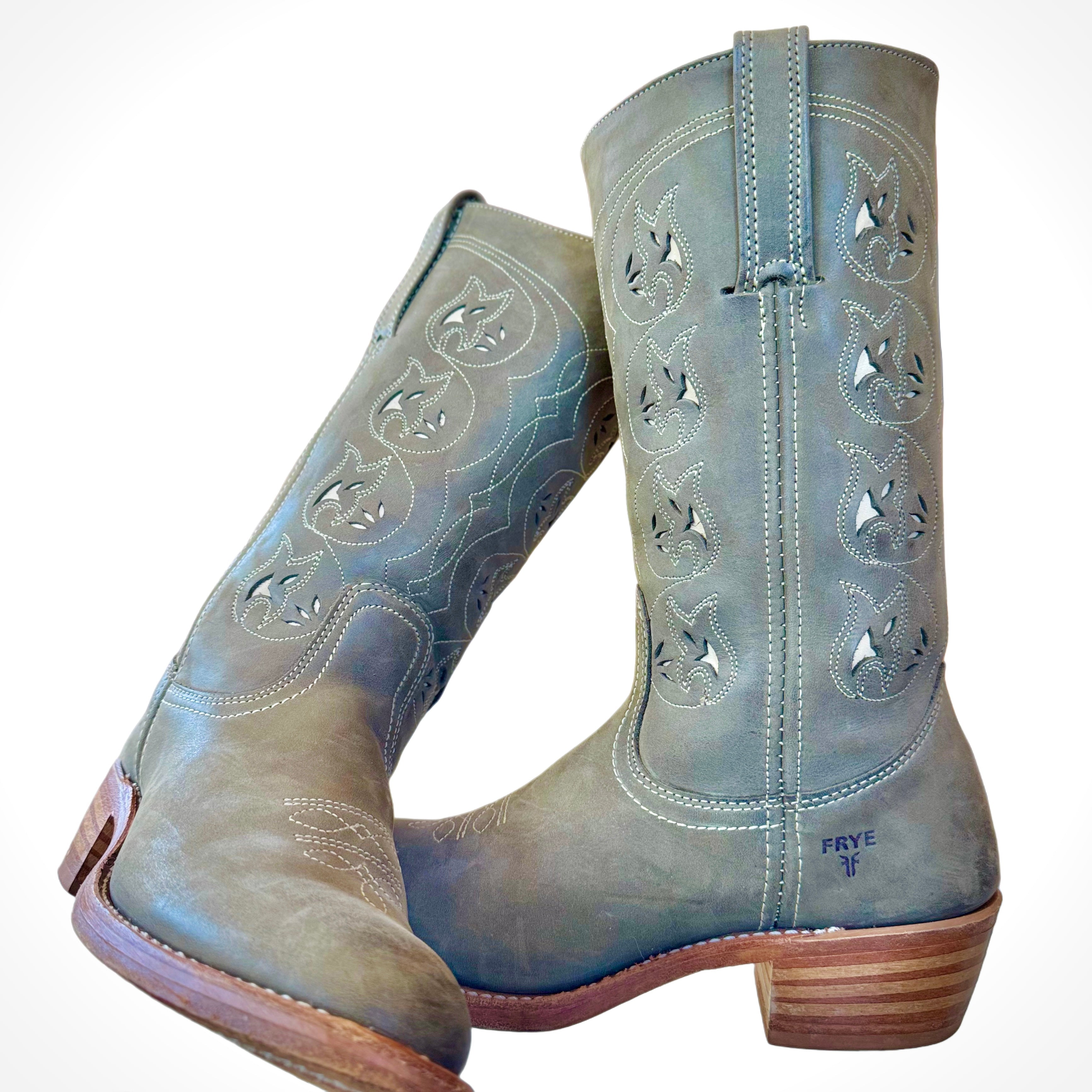 Vintage FRYE Austin Flower Green Leather Cowboy Boots — a western Campus vibe.