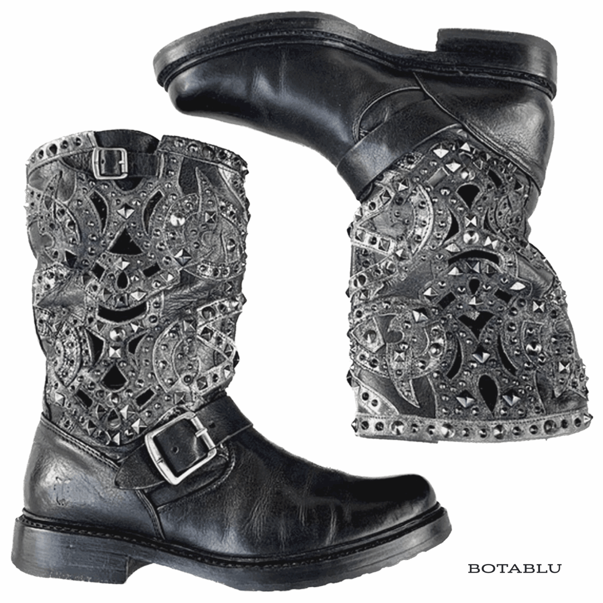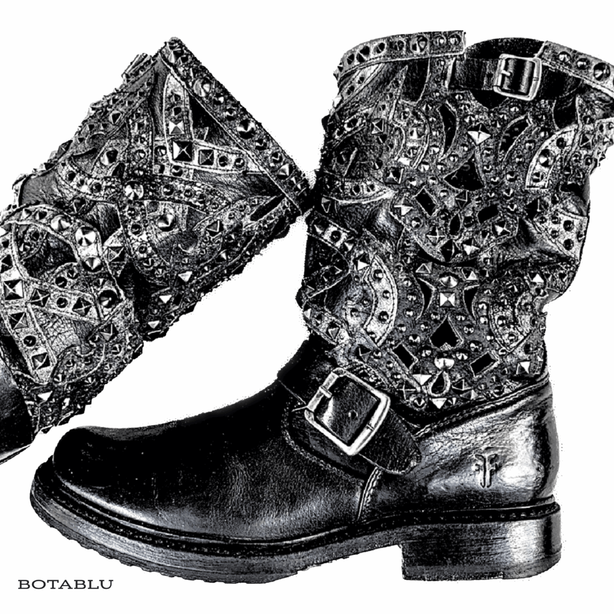 FRYE Veronica Laser Cut Out Studded Harness Black Moto Biker Boots
