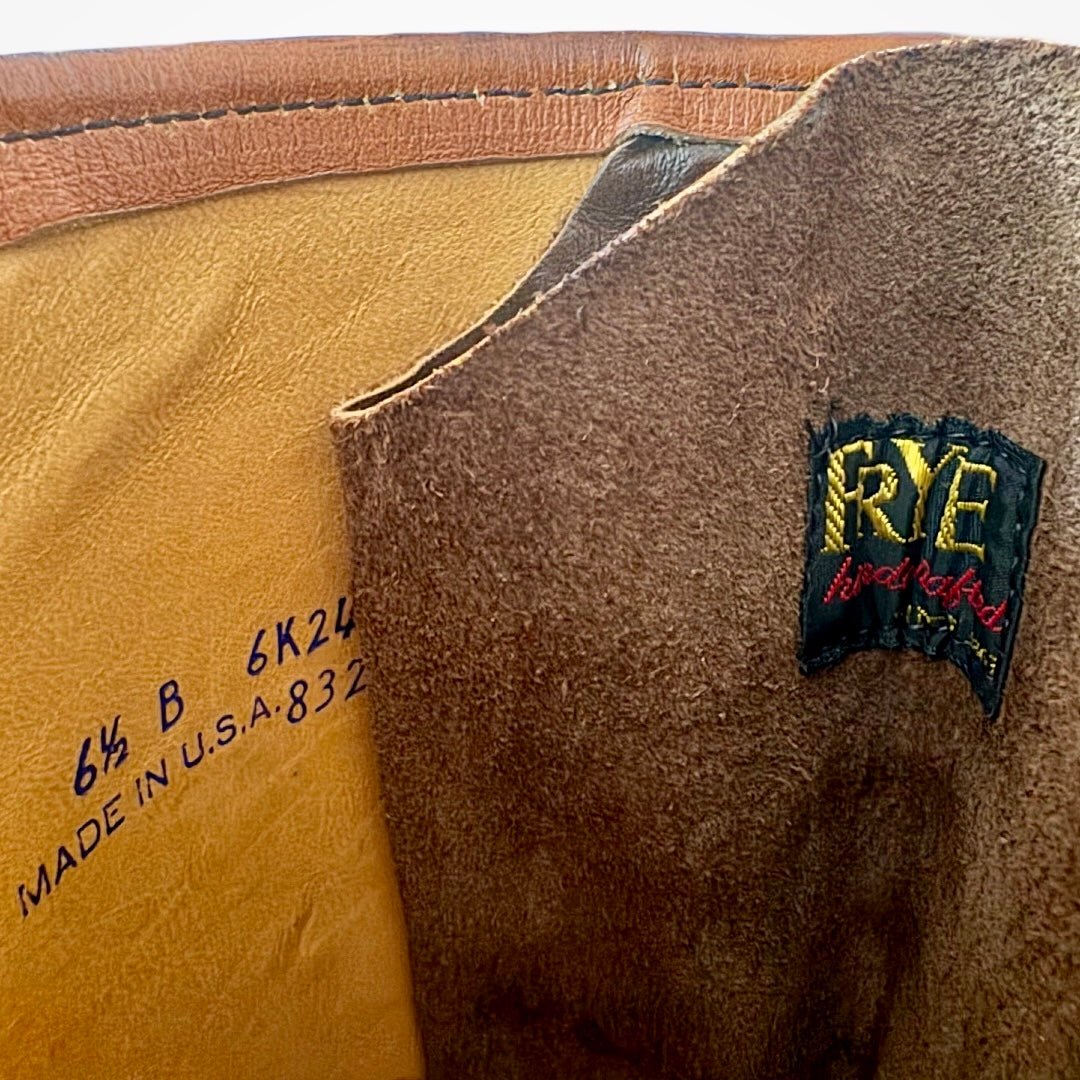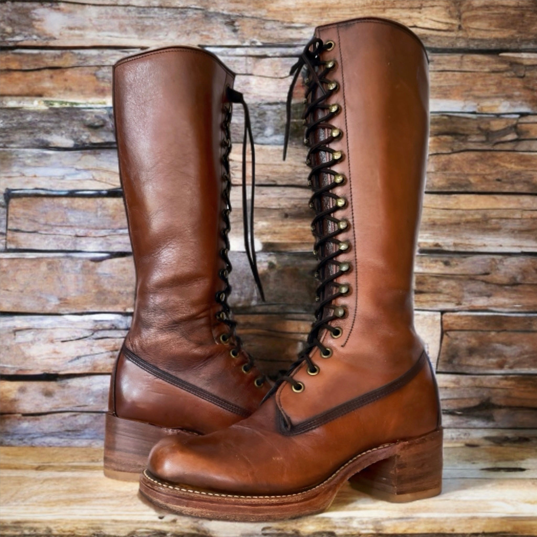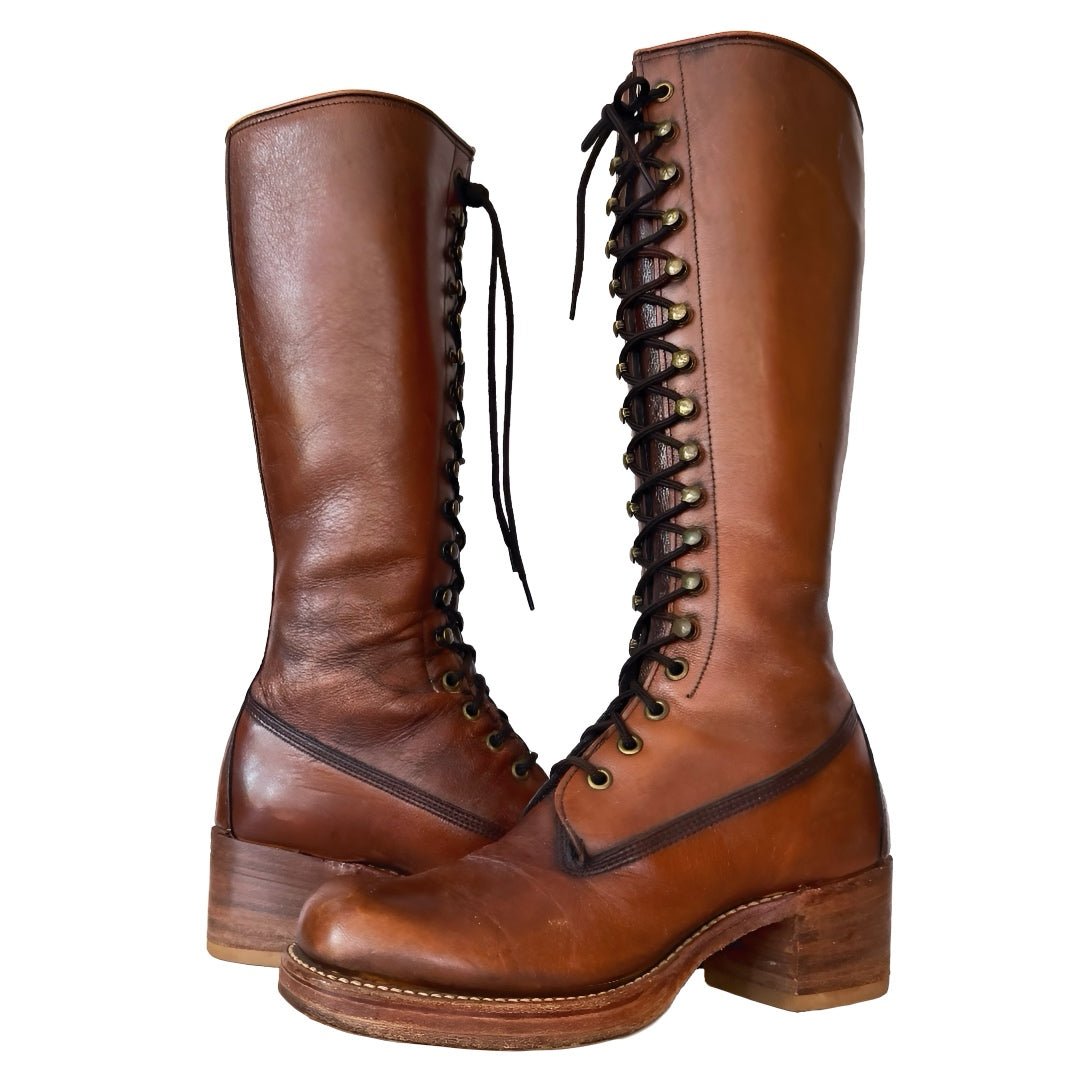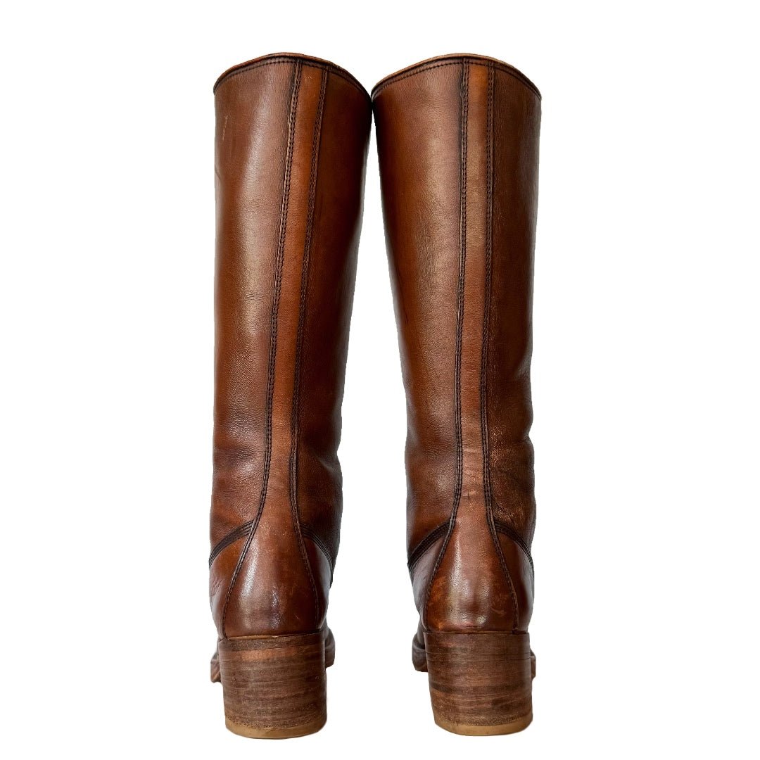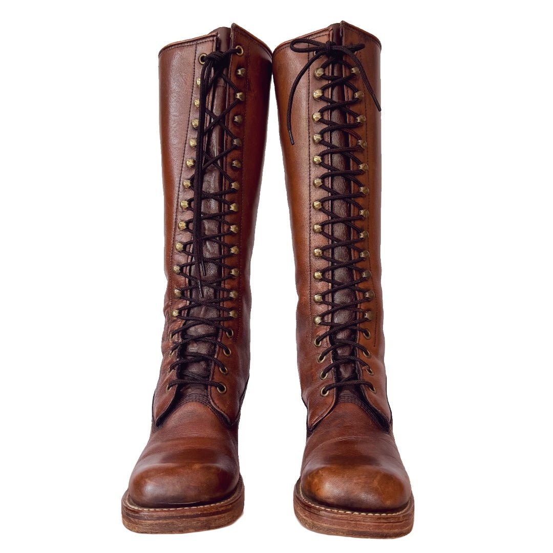 Original FRYE true vintage black label campus lace up, tall knee high, brown leather boots — in stellar vintage condition.