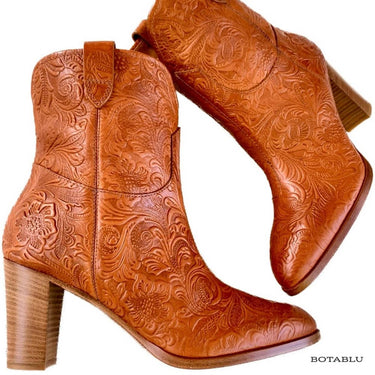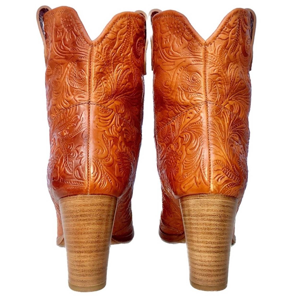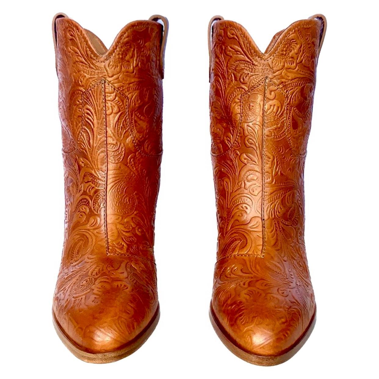 Extremely Rare and Absolutely Spectacular FRYE Tooled Brown Leather Italian Western Ankle Bootie Boots — in New Condition