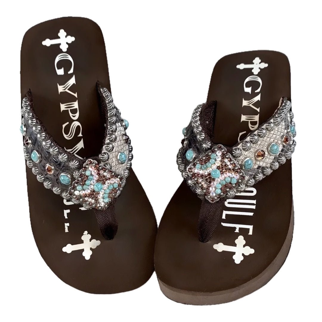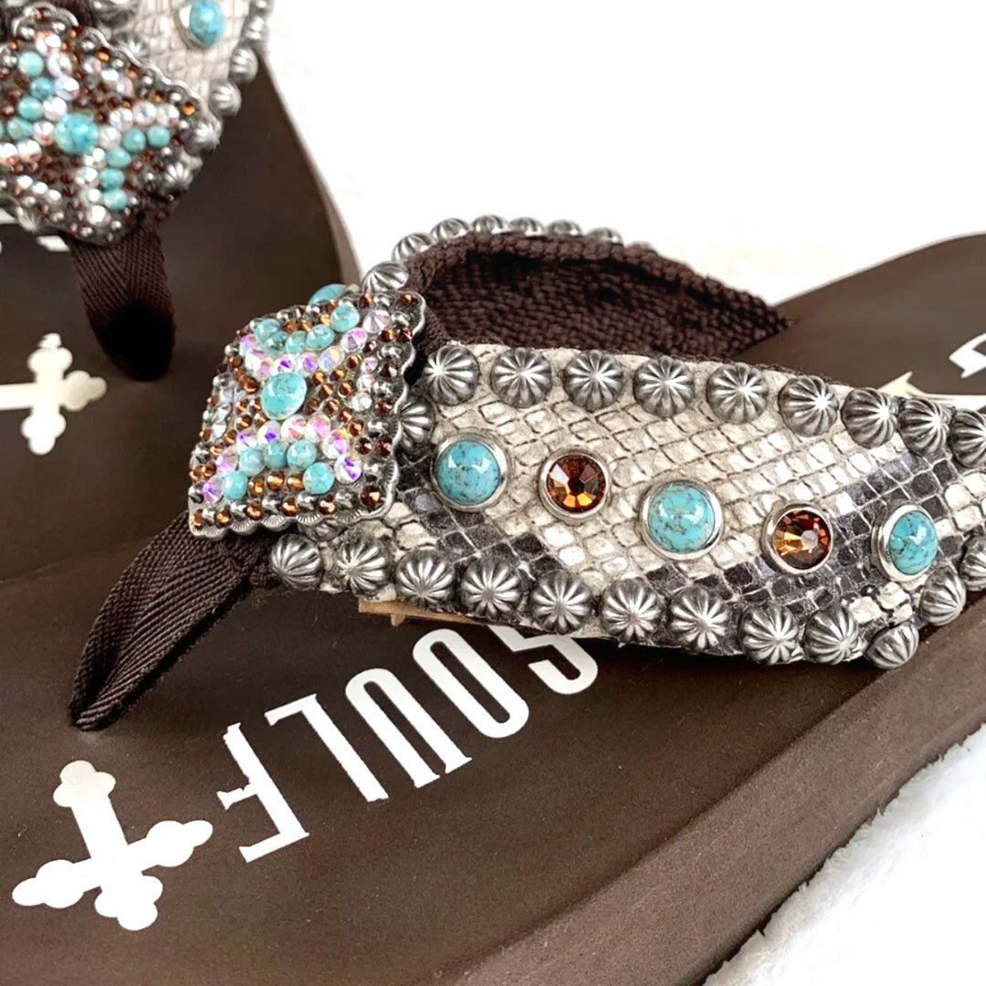 Discontinued, Sold Out GYPSY SOULE Turquoise Stone and Amber Swarovski Crystal Silver Studded Bling Embellished Snakeskin Python and Gator Crocodile Exotic Animal Print Leather Western Cowgirl Wedge Platform Flip Flop Brown Sandals