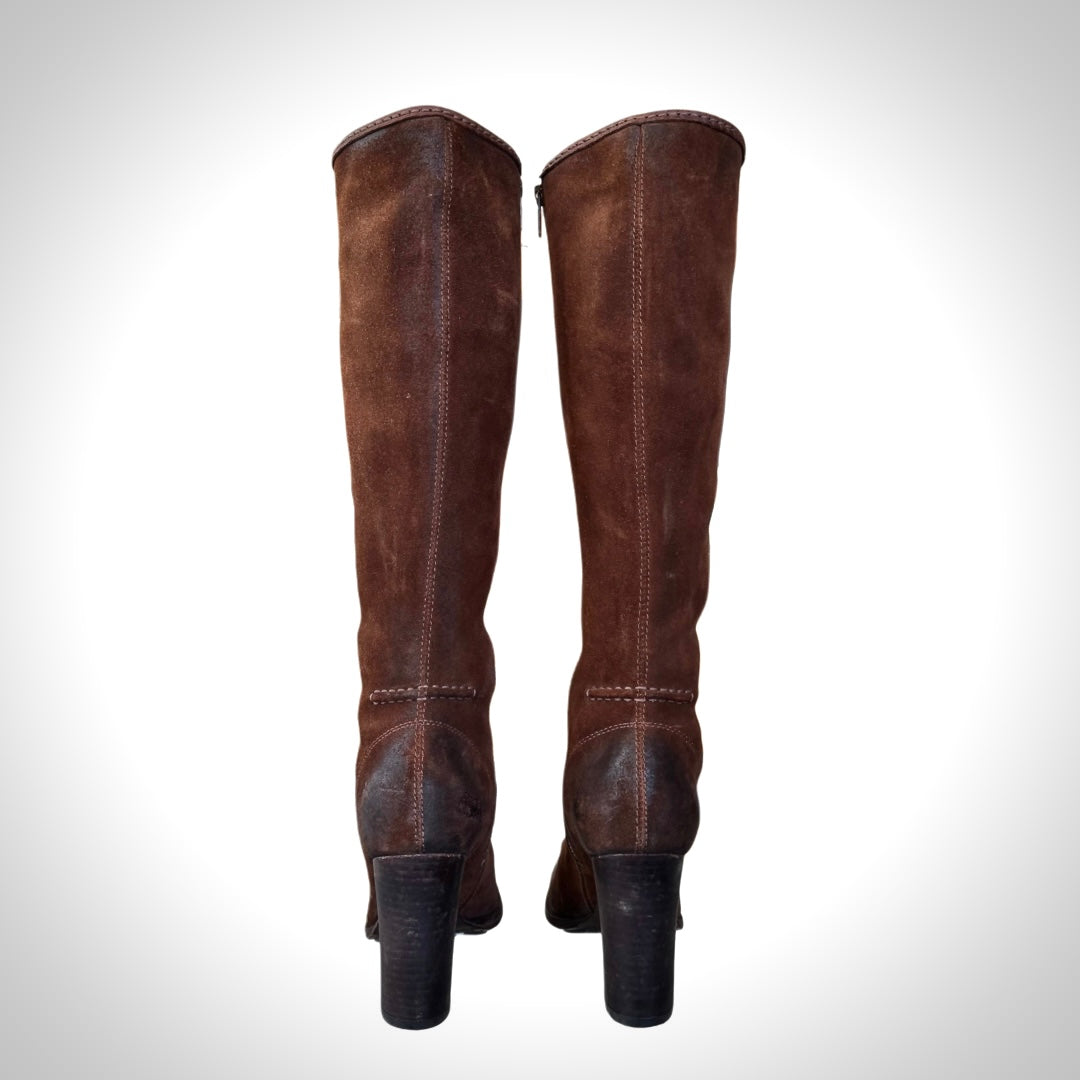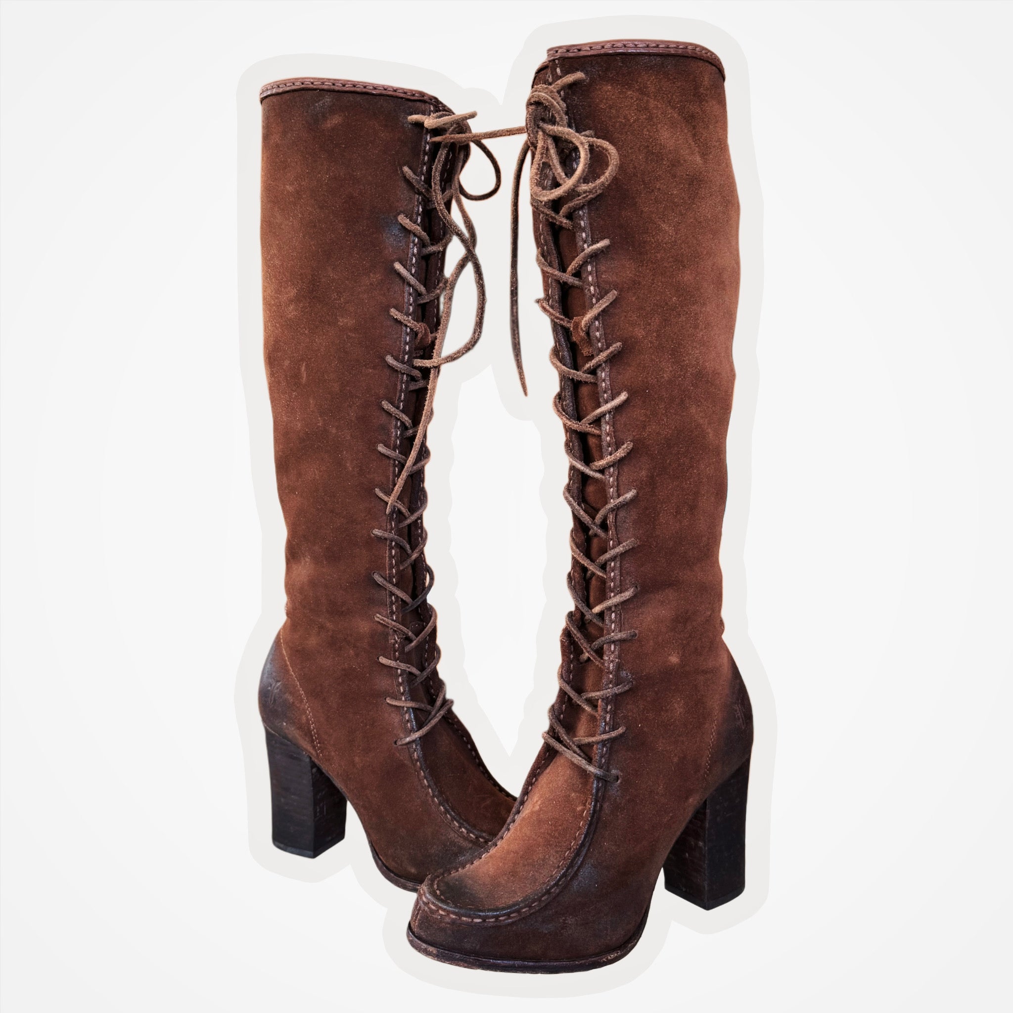 FRYE Parker Moccasin Lace Up Tall Knee High Zippered Brown Brushed Leather Boots