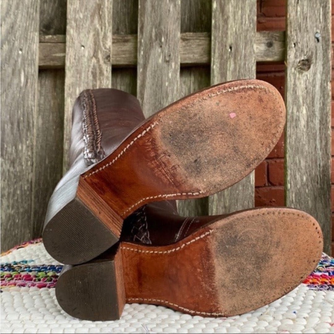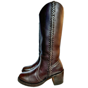 Gorgeous, Excellent Condition, Frye Vintage White Label Braided Tall Knee High Dark Walnut Brown Leather Boots