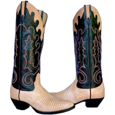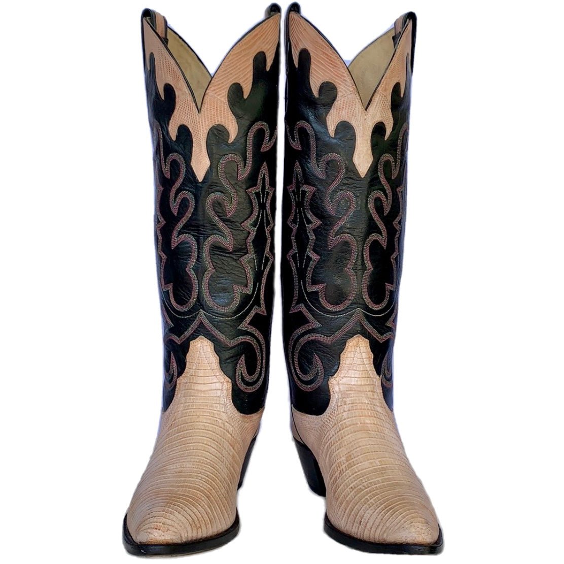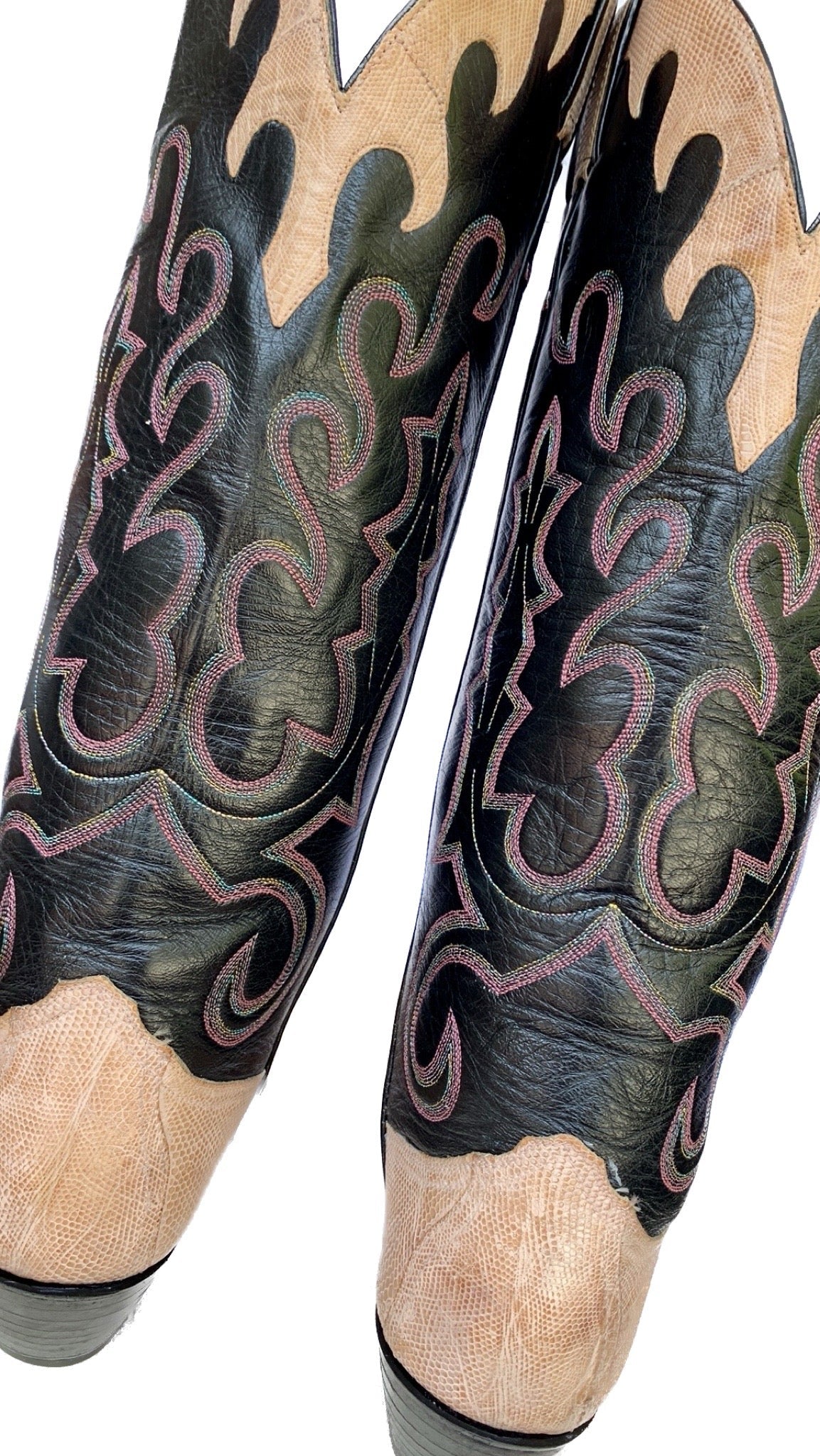 LARRY MAHAN Vintage Pink Lizard Exotic Black Leather Tall Knee High Cowgirl Cowboy Western Boots