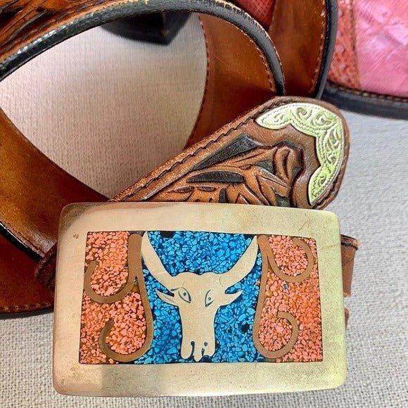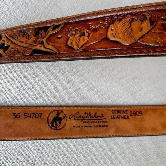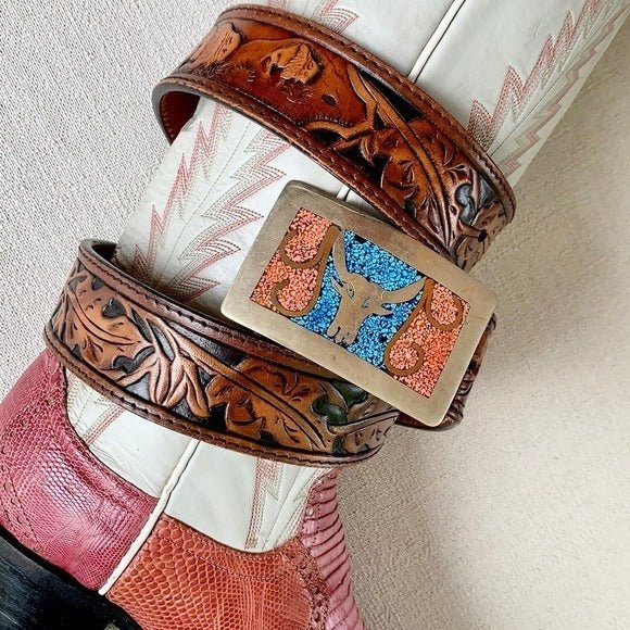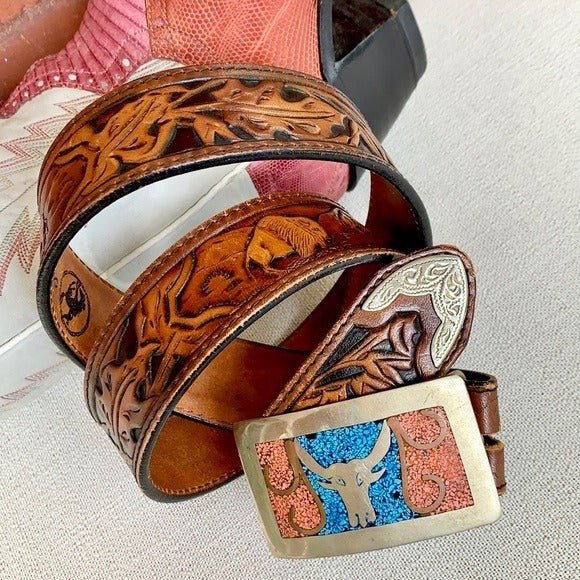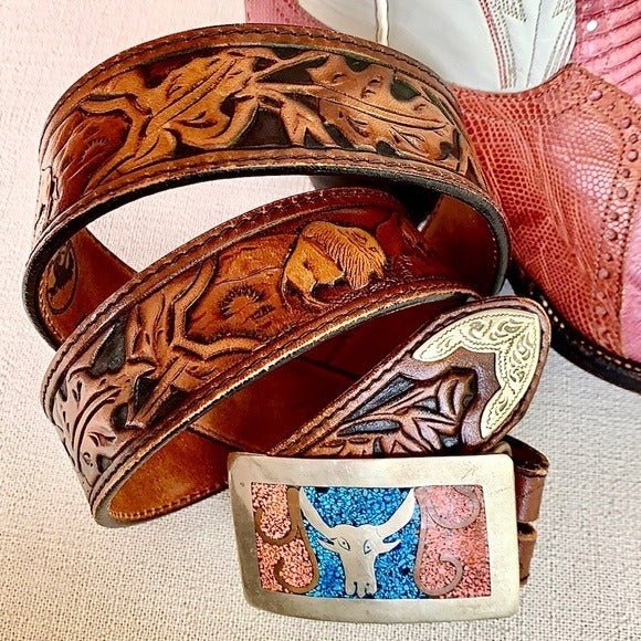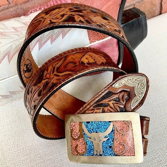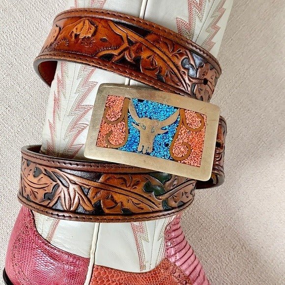 Gorgeous Vintage LARRY MAHAN Vintage Tooled Genuine Leather Buffalo Floral Leaf Western Belt with Silver & Brass Tone Turquoise Coral Belt Longhorn Western Belt Buckle