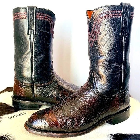 LUCCHESE Black Cherry Smooth Ostrich Exotic, Black Leather Roper Cowboy Western Boots