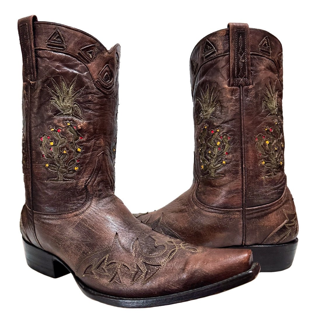 OLD GRINGO discontinued men’s cowboy boots in a rustic brown leather with green and red cactus inlays, desert theme.