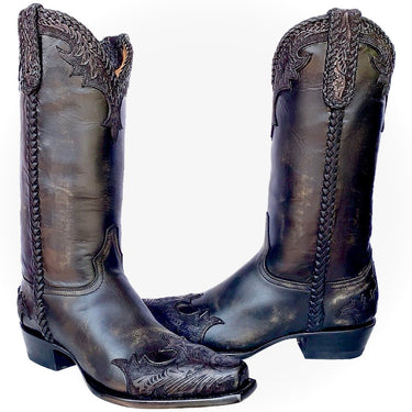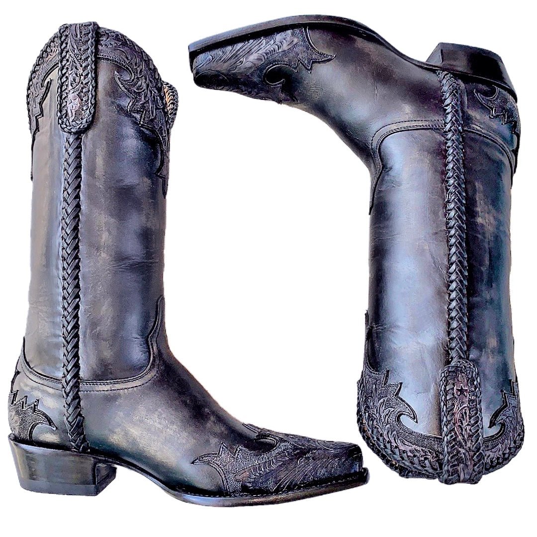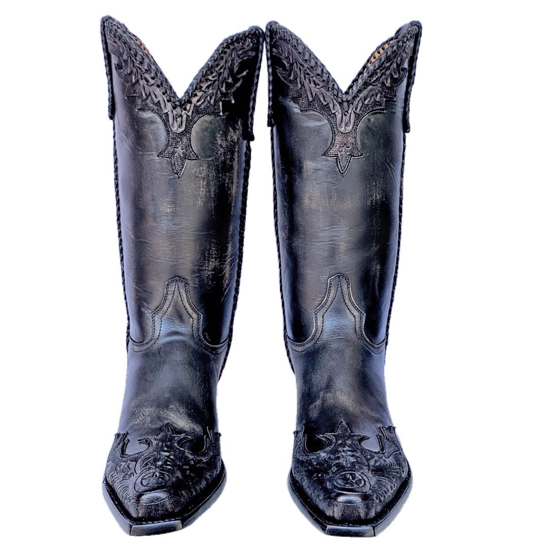 Handmade in Mexico of gorgeous antiqued black leather with hand tooling around the collar, toe, and heel. Featuring stars in an etched design and braided side piping and collar. Spectacular works of art!