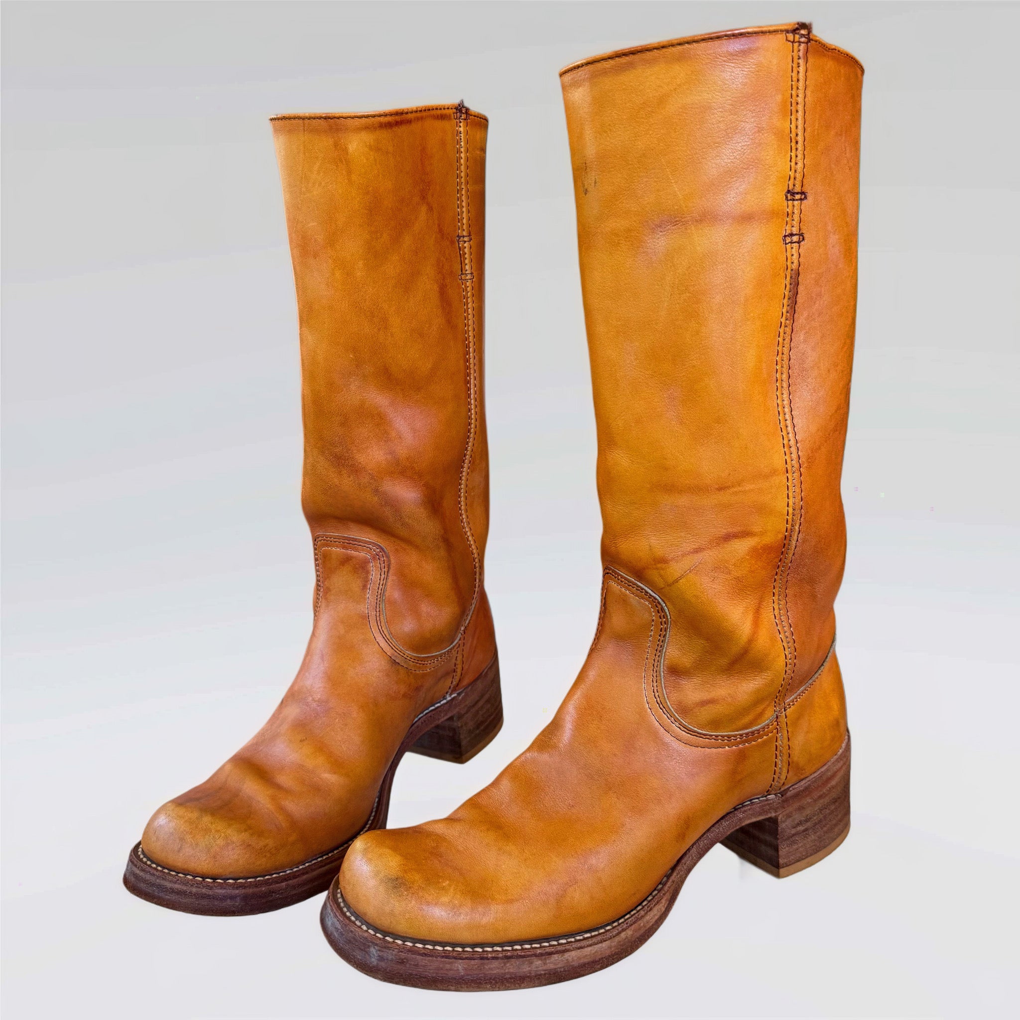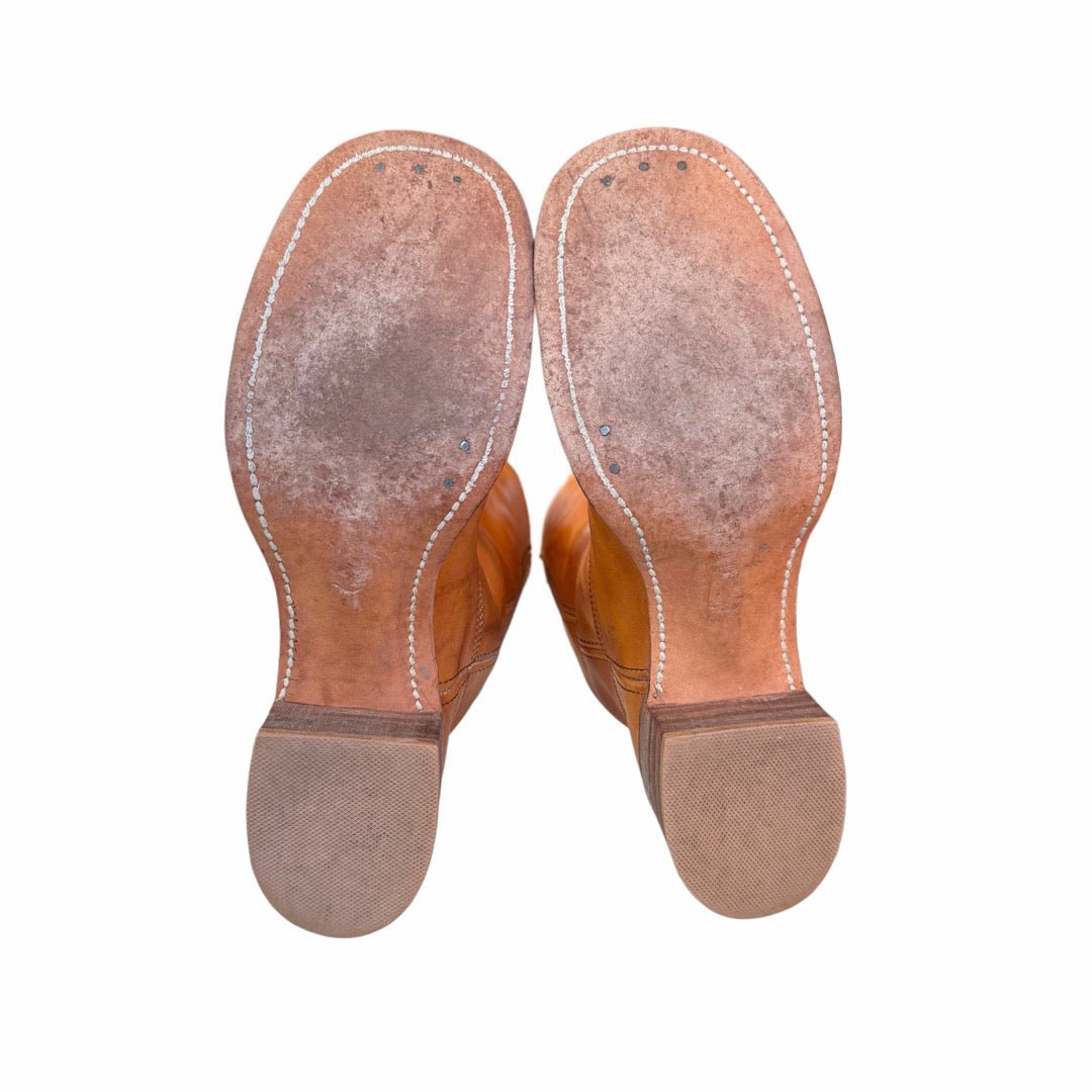 Rare 1960’s - 1970’s Frye true vintage black label treasures. Tall western motorcycle campus boots, benchcrafted in a gorgeous sunrise golden orange-brown leather. Late 60’s to early 1970’s — when Frye made their very best! A tall—mid-calf height, chunky sole and heel, and square toe. Extremely hard to find in these larger women’s sizes—particularly in this condition.