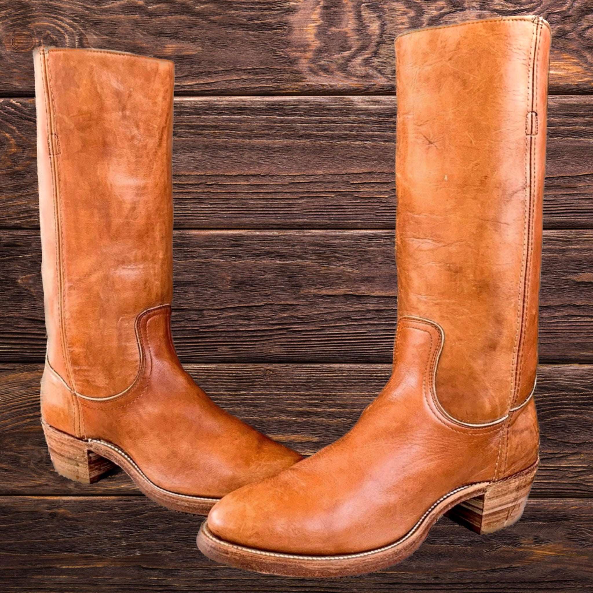 Gorgeous, Rare Vintage in NEW Condition. FRYE Western Campus Style Golden Brown Leather Chunky Heel Boots