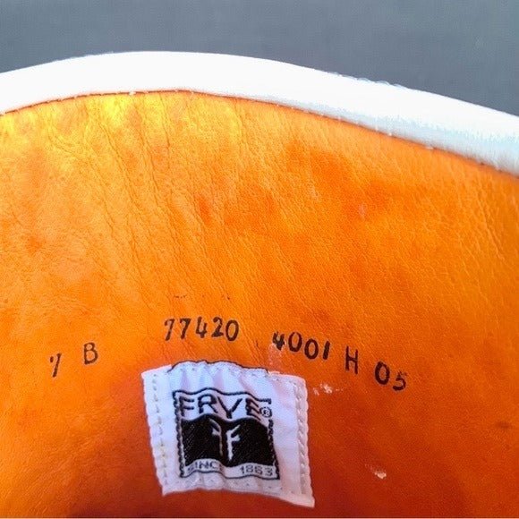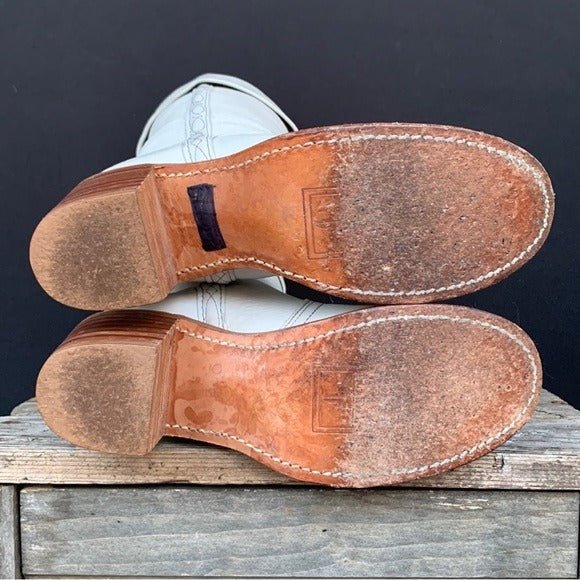 FRYE Vintage Creamy White Tall Inlay Leather Embroidered Stitching Cuff Stacked Chunky Heel Cowgirl Cowboy Western Riding Boots