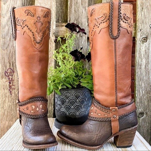 INDOMABLES Harness Tooled Braided Brown Leather Tall Cowgirl Western Boots