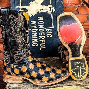TIN HAUL Checkerboard Patchwork Heart Square Toe Cowboy Cowgirl Western Boots