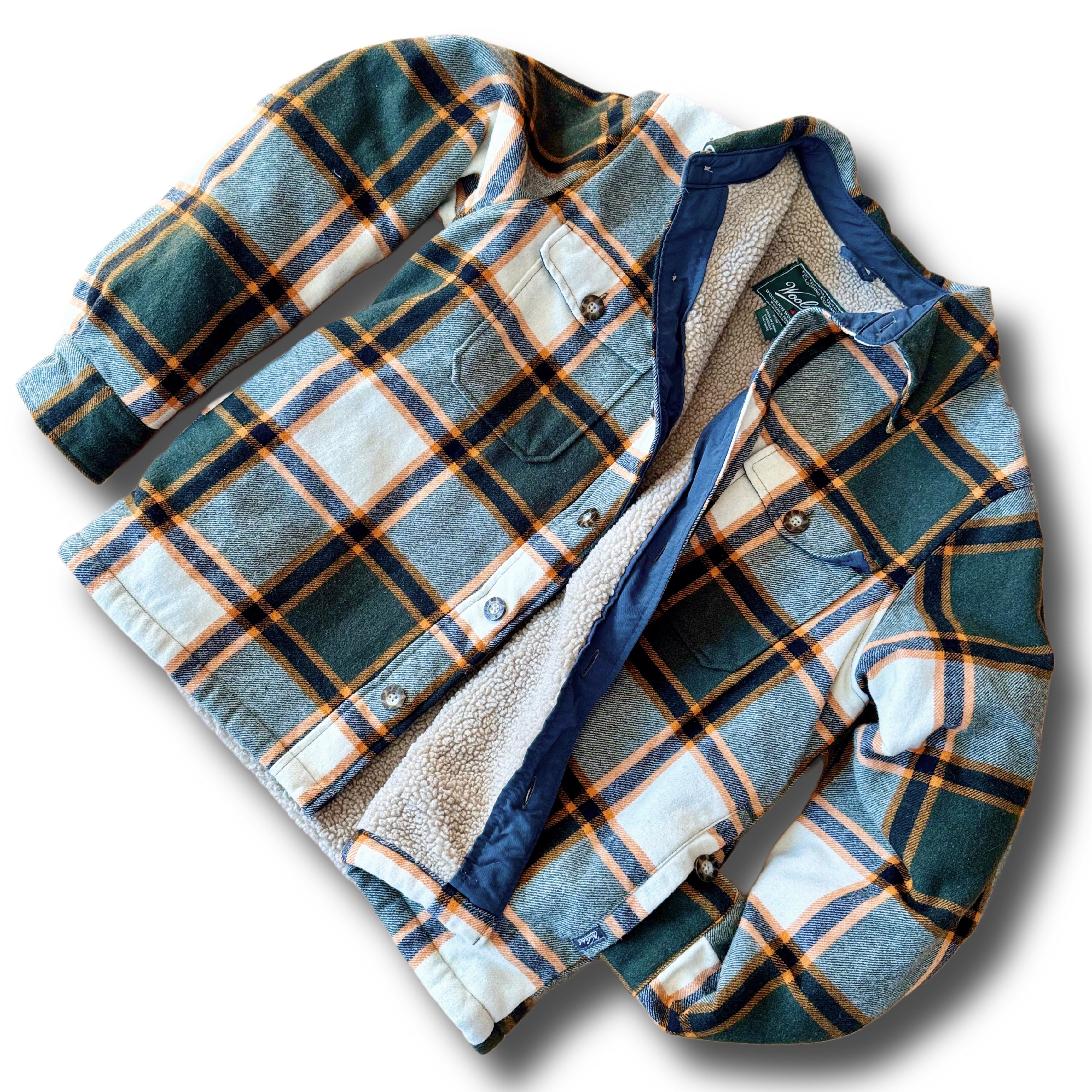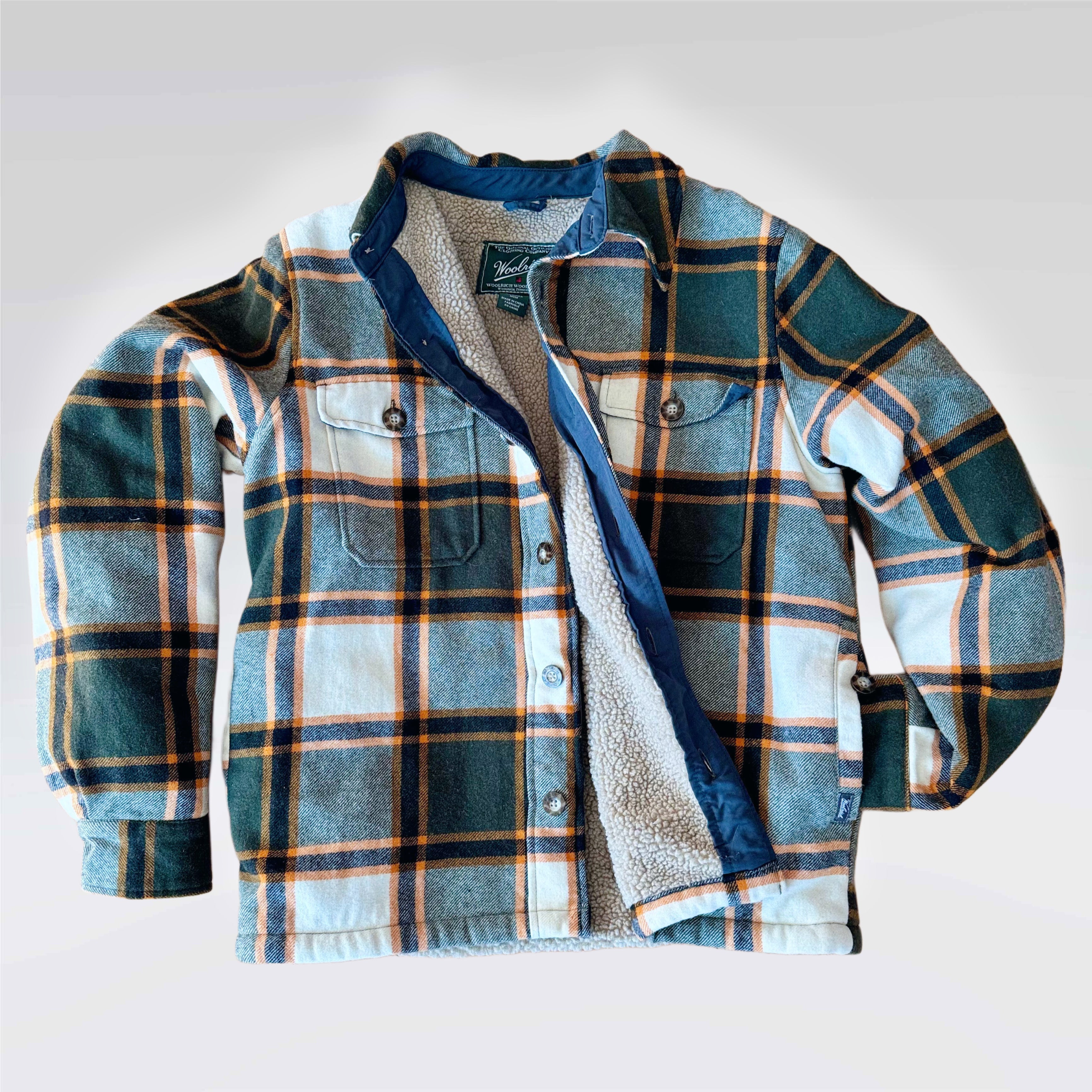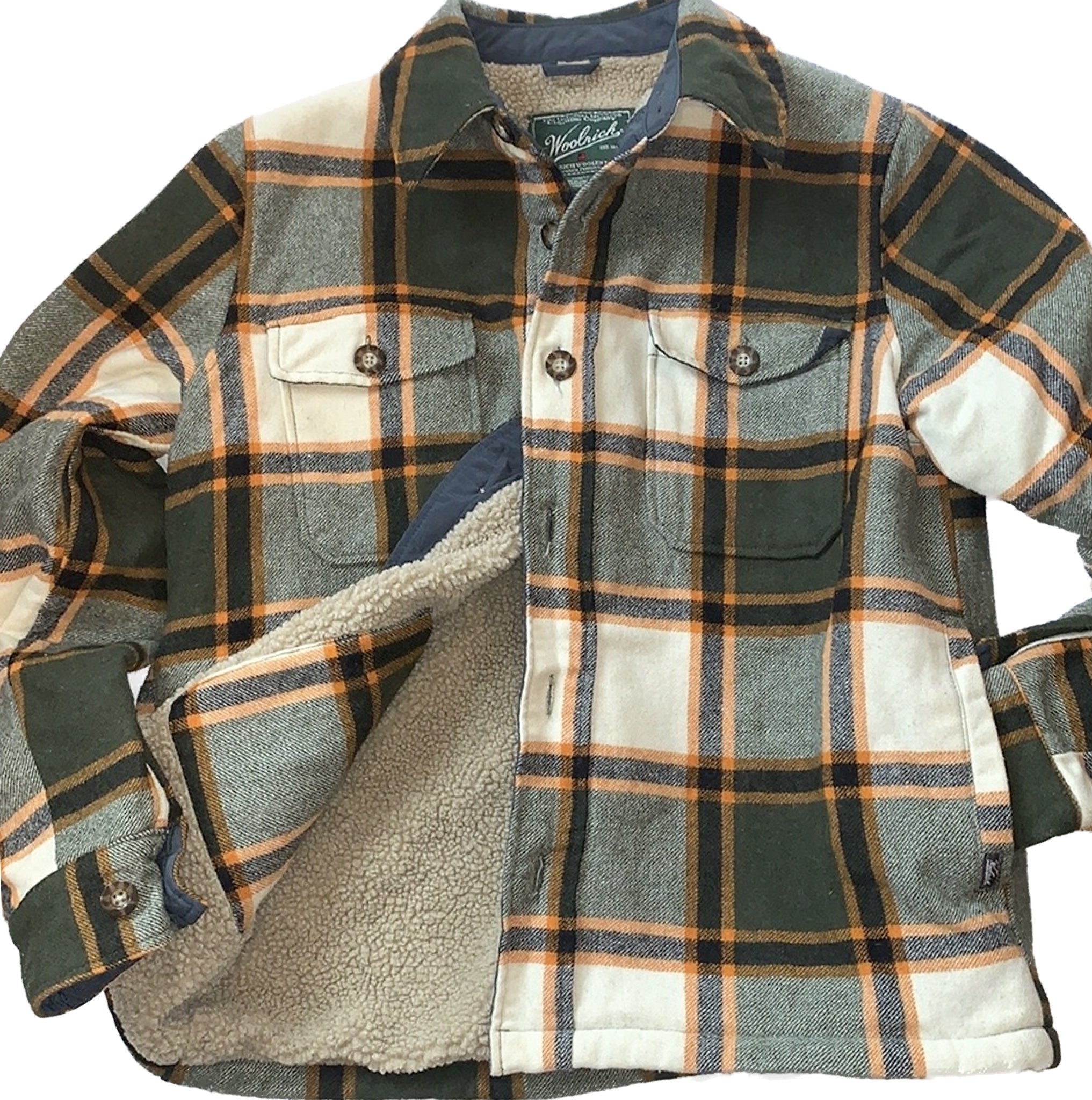 Excellent Condition WOOLRICH Sherpa Fleece Lined Wool Plaid Checkered Button Down Shirt Coat Jacket Shacket