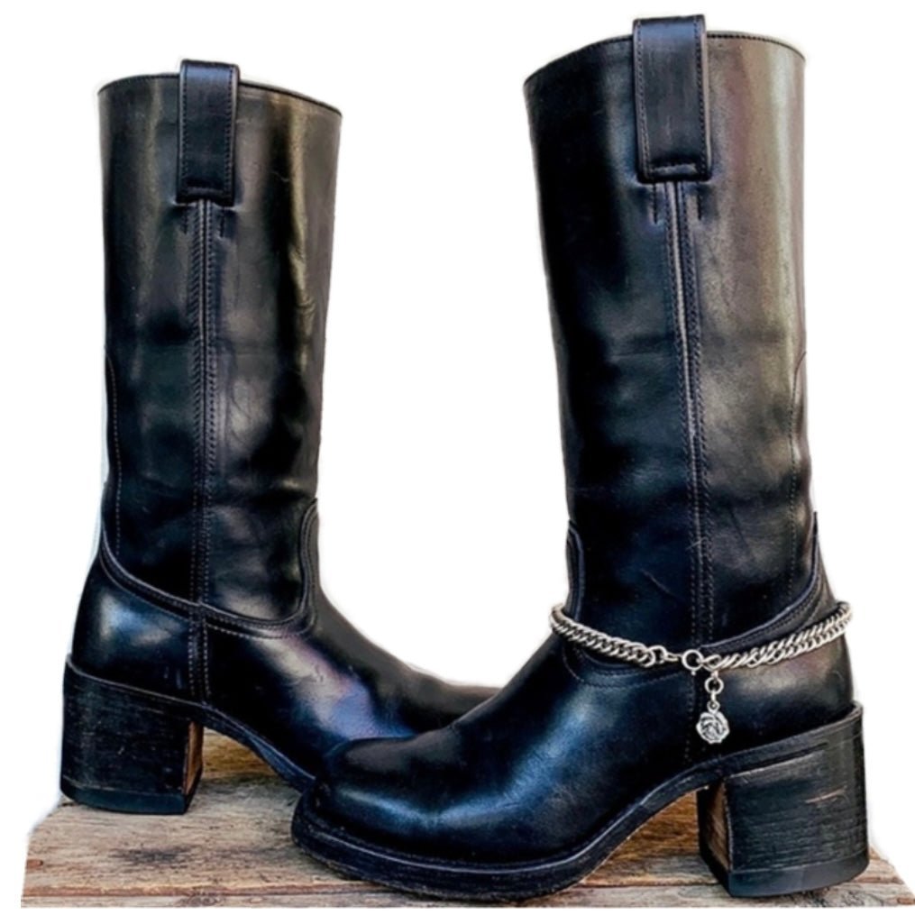 Amplify your style with this killer Silver Rose Boot Chain Strap Jewelry Accessory. Durable, silver-like in weight and appearance, the adjustable length is perfect for most any women's boots. Transform your Harley-Davidson, Sendra, Frye, or any Biker Motorcycle, Platform, Chunky, Boho Western or Cowboy Cowgirl Boots!