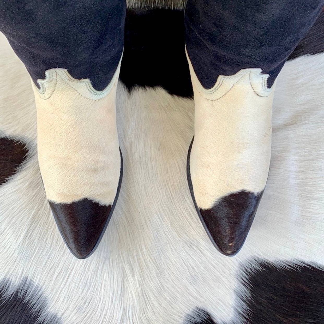 Beautiful Vintage CODE WEST By DAN POST Pony Cowhide Calf Hair On Cow Print Leather Cowgirl Cowboy Western Boots — with Original Box