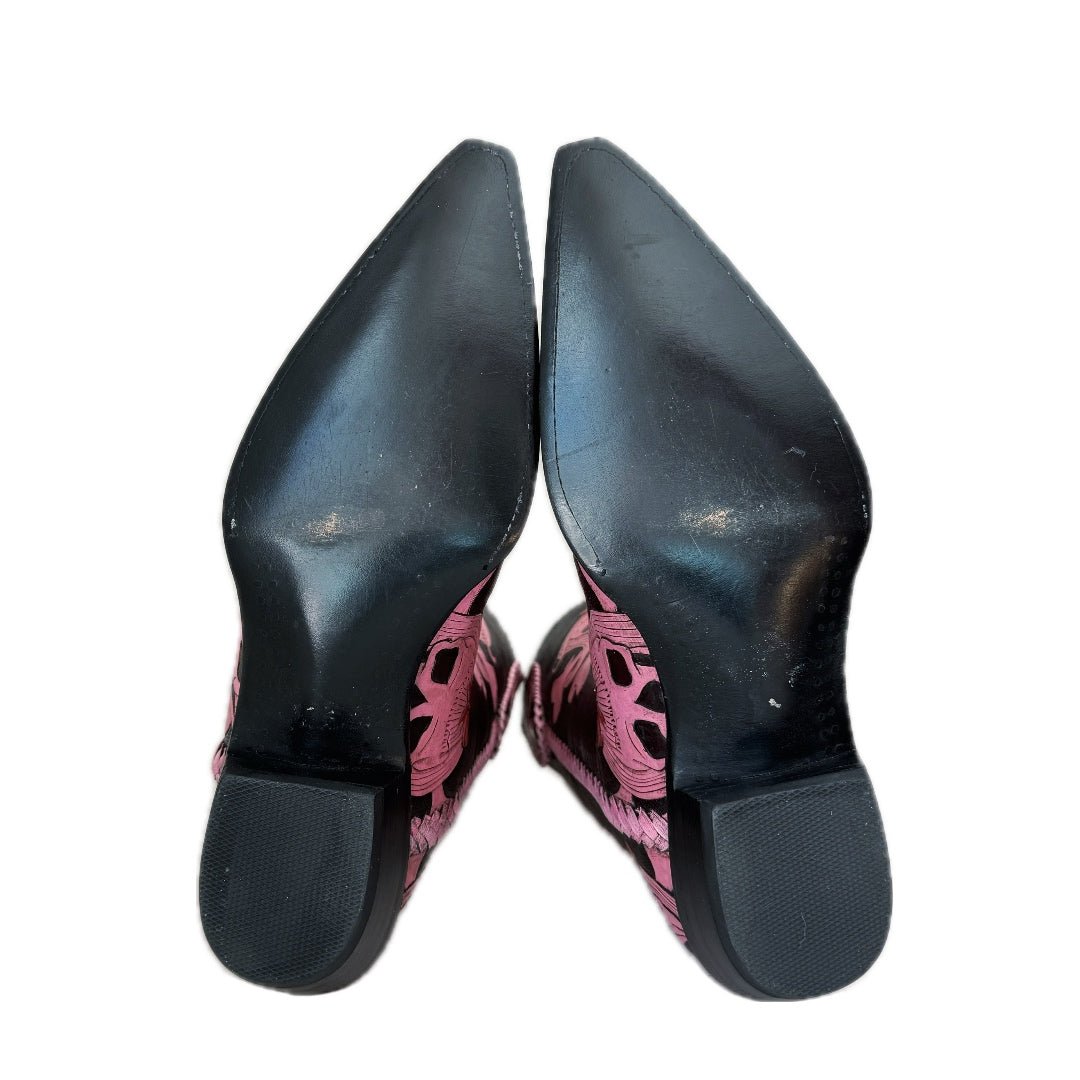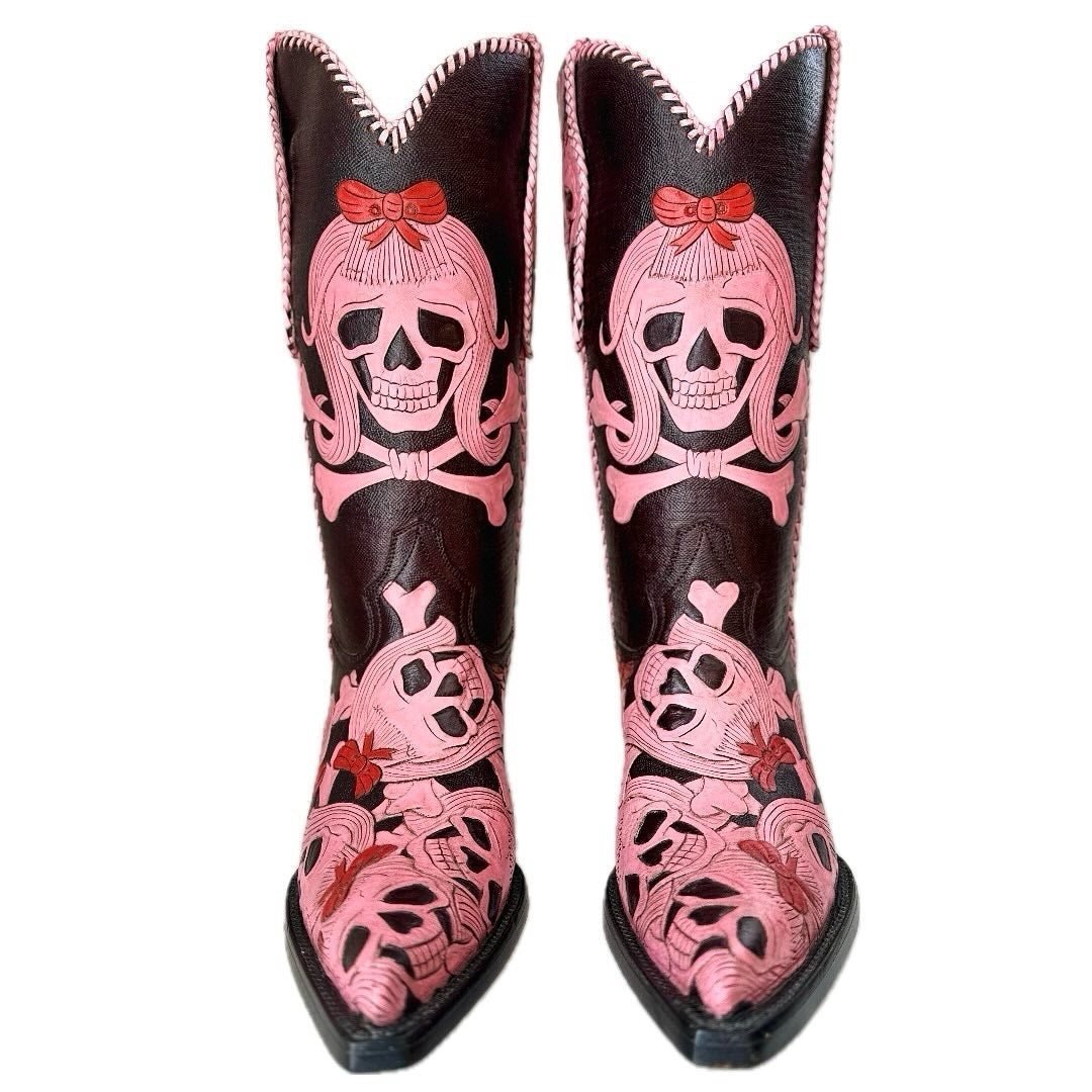 Extremely Rare, from a top custom handmade boot company, no longer in existence — even more exceptional: in new condition! Handmade, Hand-Tooled, feminine pink she-skulls & crossbones with red bows over contrasting black leather; braided pink leather stitching detail, double hand-pegged lemonwood leather soles, stacked leather heels, tall mid-calf height and snip toe.