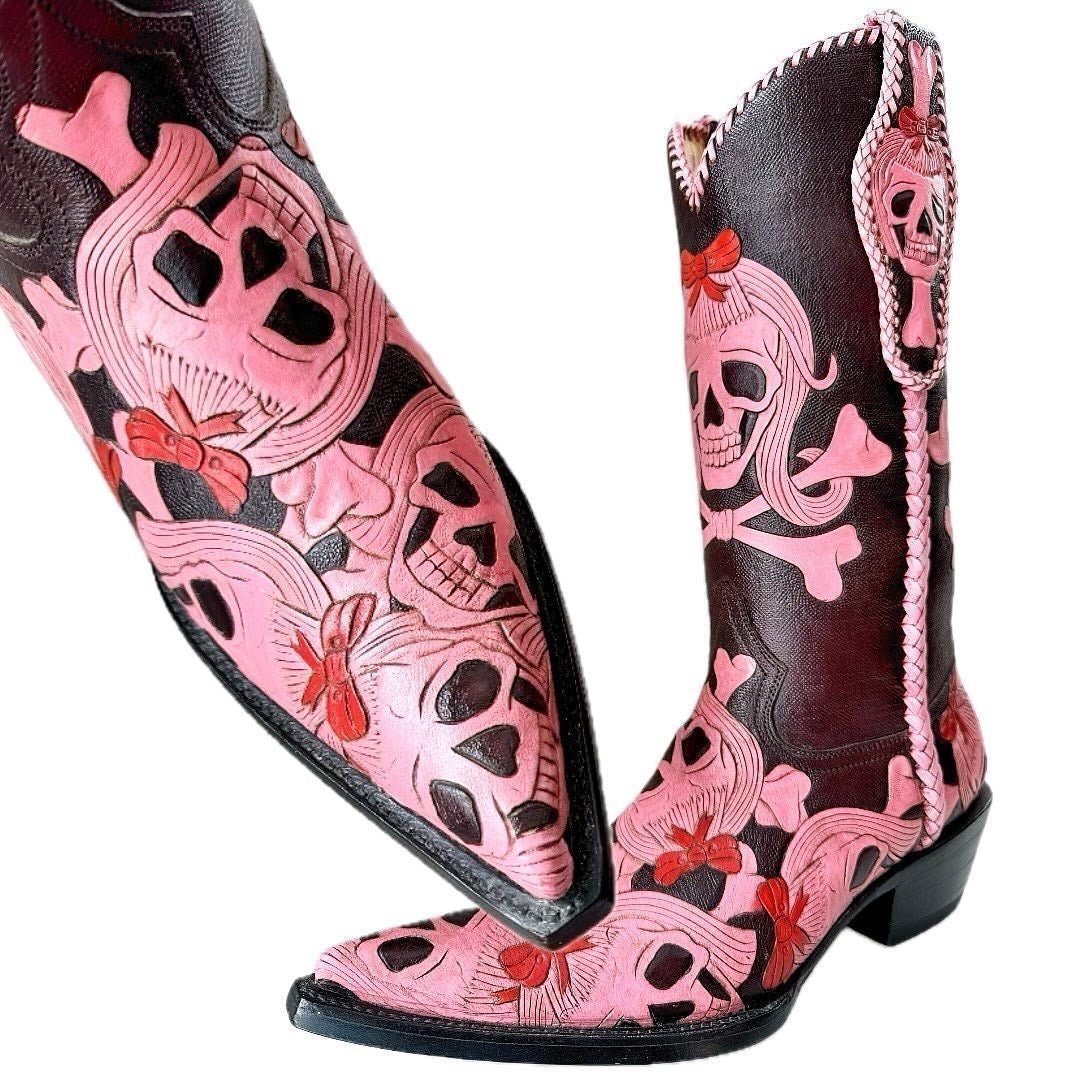 KILLER. Handmade Custom CRAZY HORSE Vintage Tooled Pink Skulls Black Leather Cowgirl Cowboy Western Boots