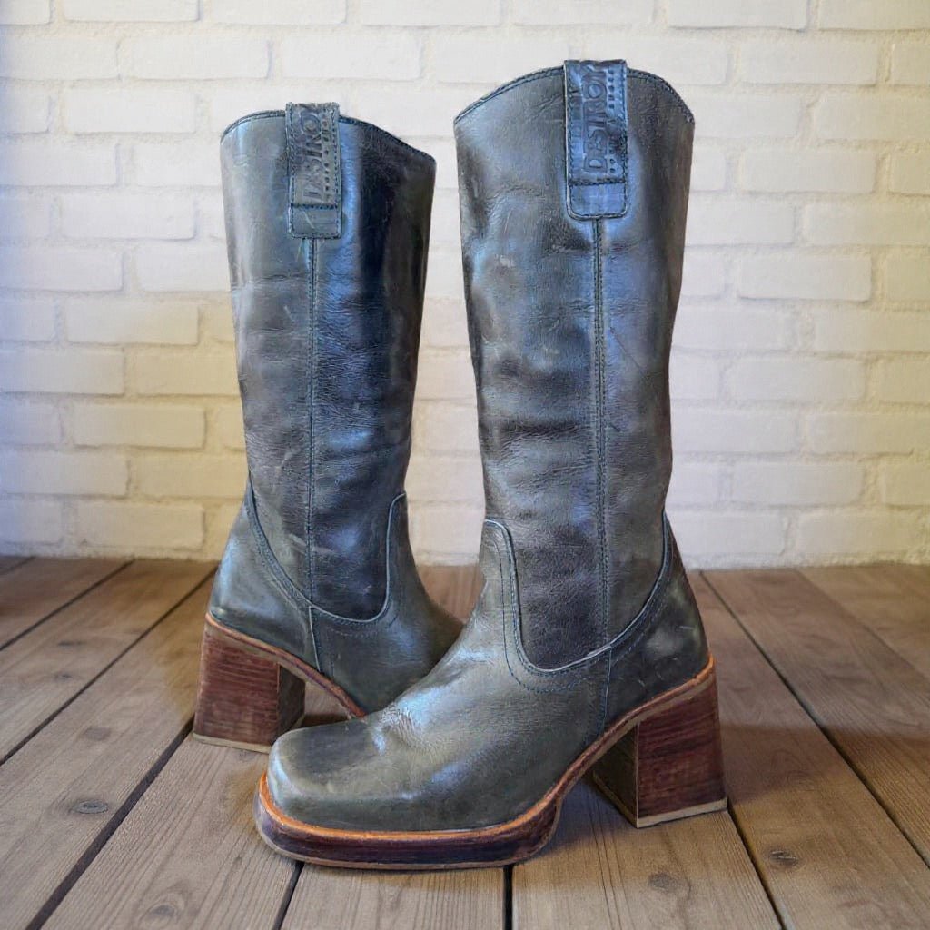 Rare model with icy blue-gray leather, wide square toe, thick platform sole, chunky heel, and tall shaft. Easy pull on.