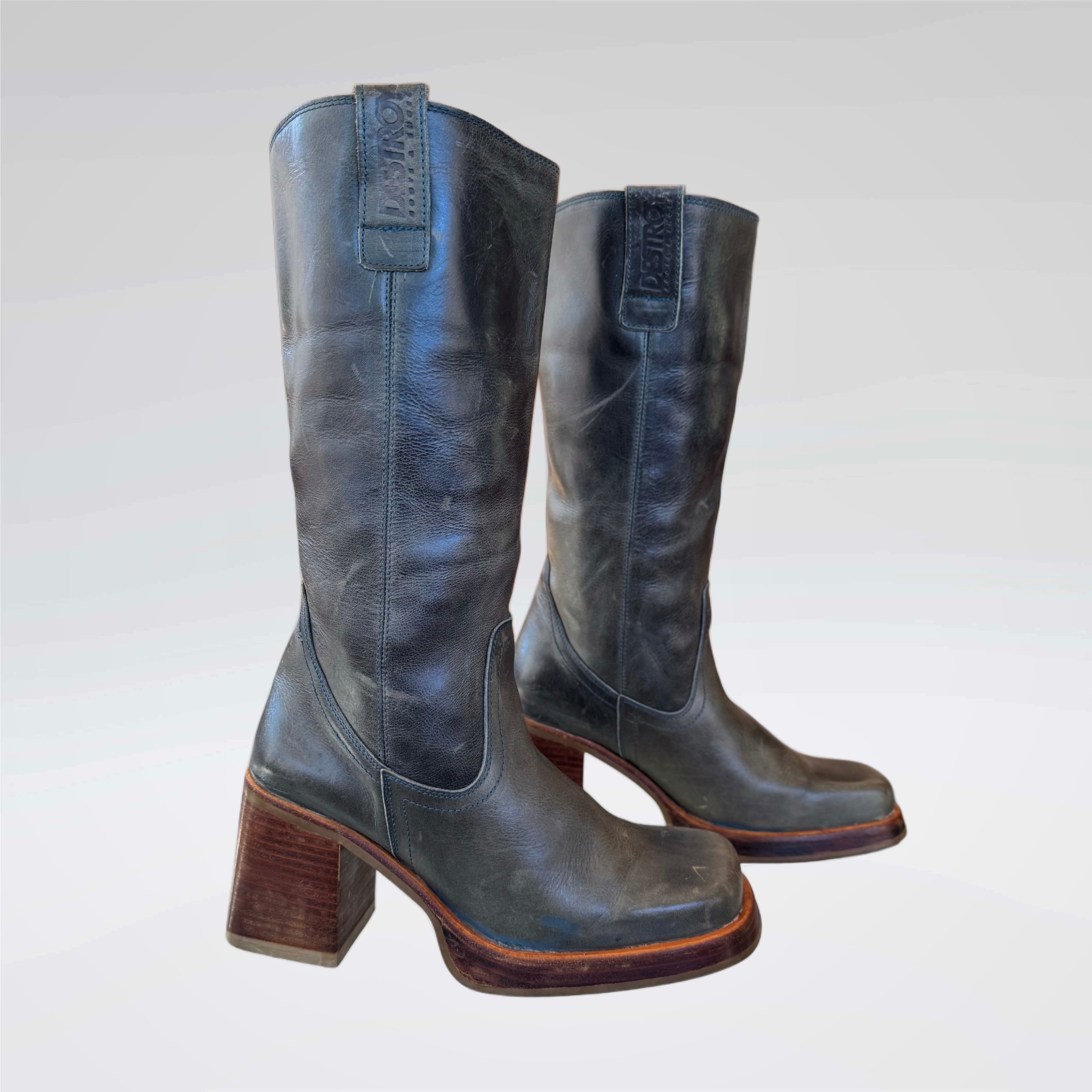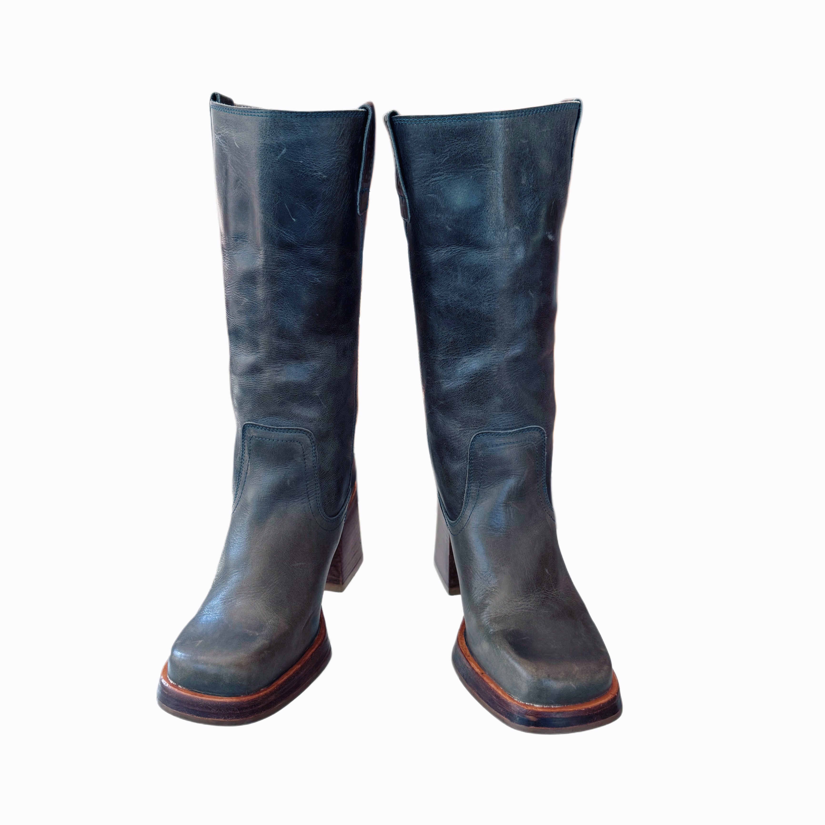 Rare Destroy Campus-Style Platform Vintage Y2K Tall Chunky Square Toe Blue Leather Boots