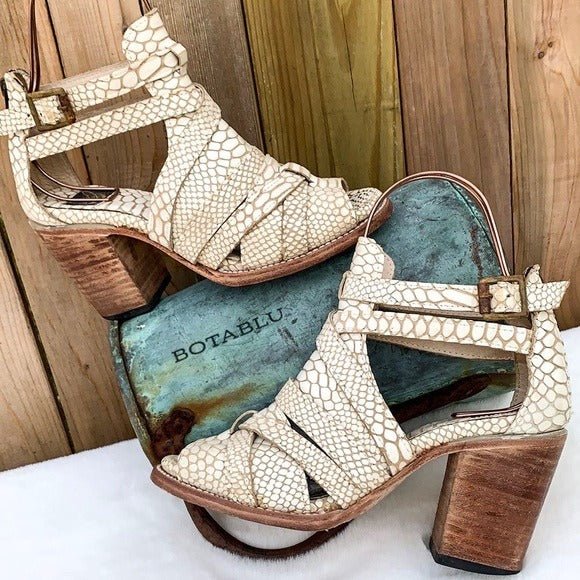 FREEBIRD BY STEVEN Claw Creamy White Snake Embossed Leather Strappy High Heel Boho Western Open Toe Sandals Ankle Bootie