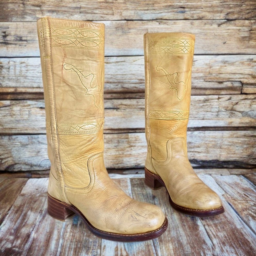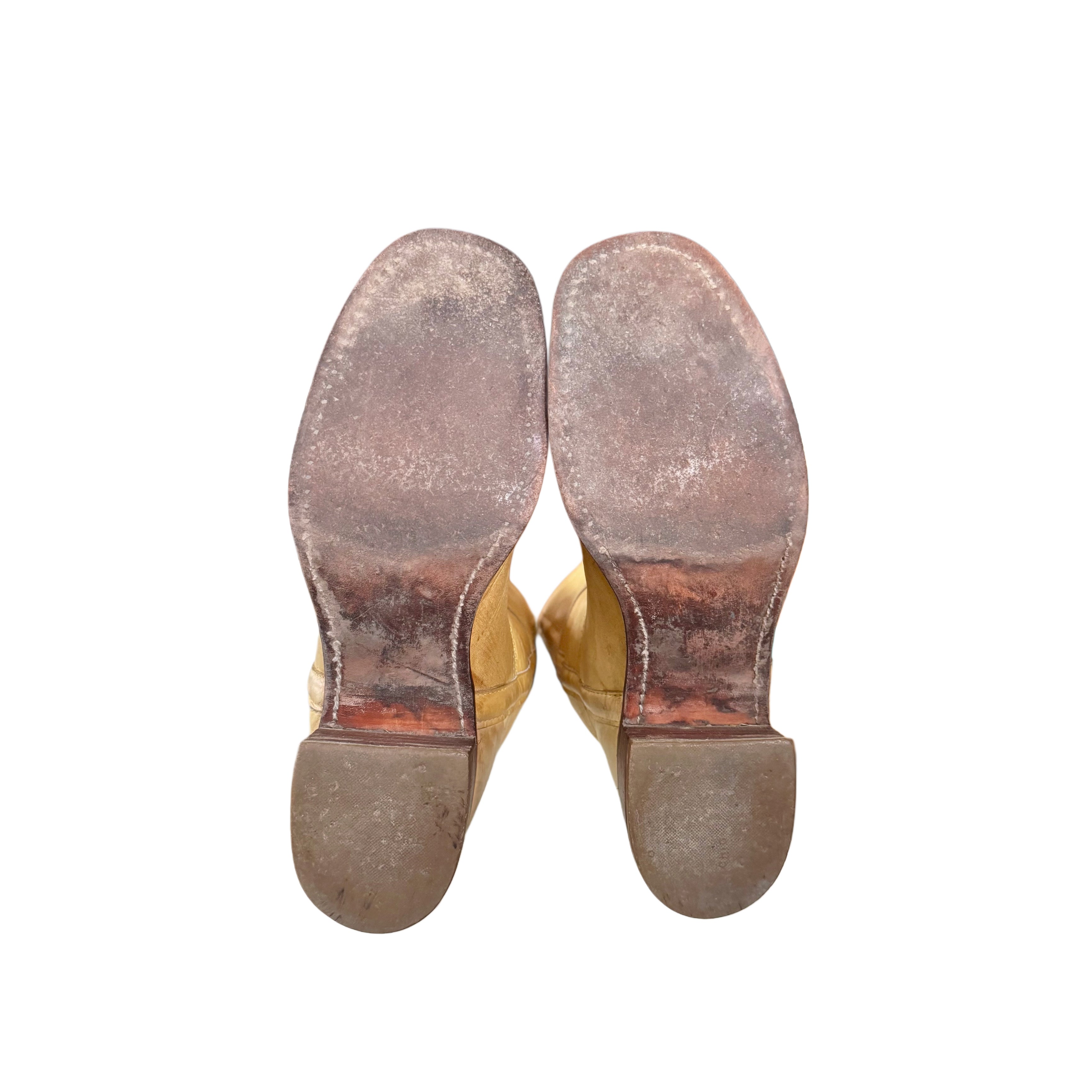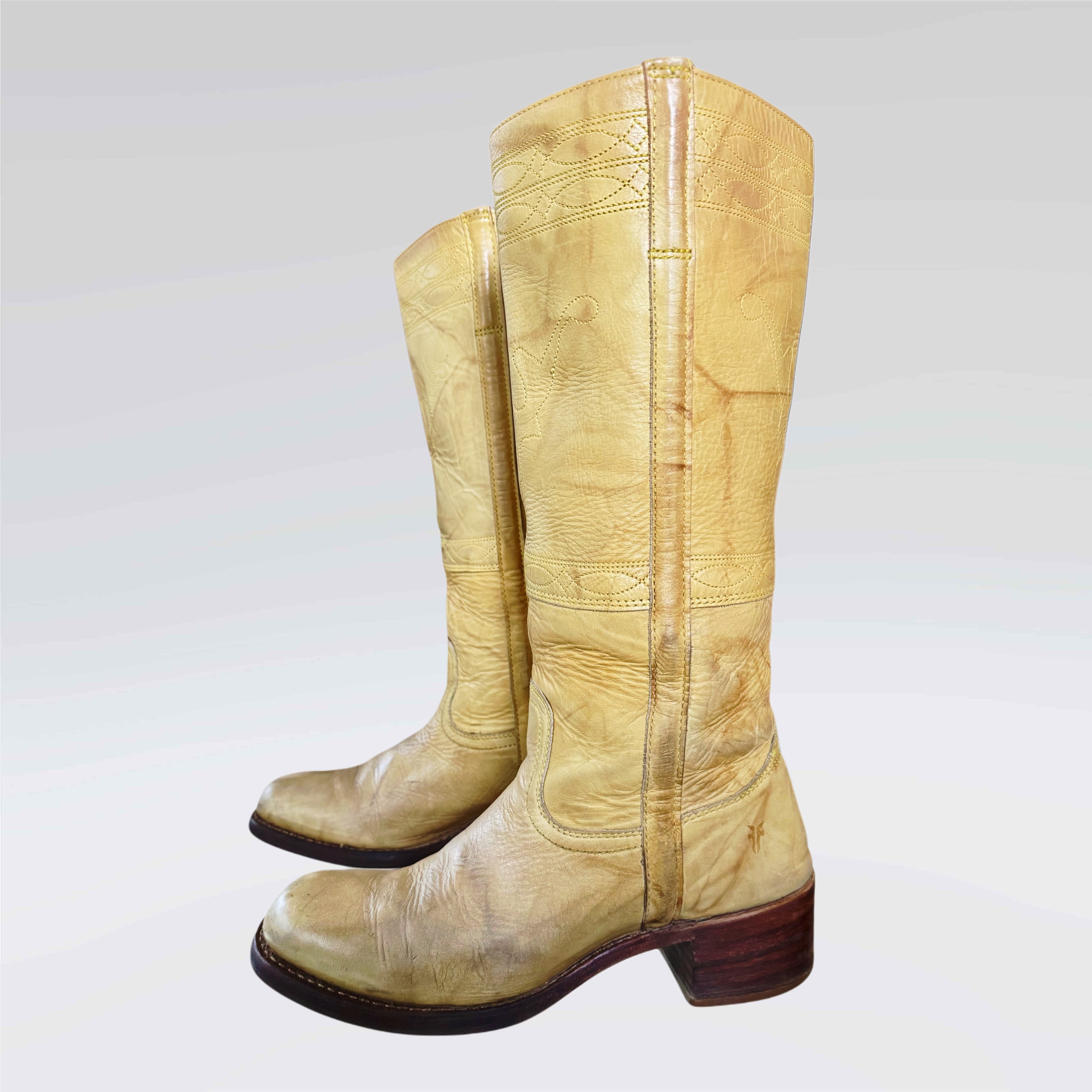Rare find: Frye campus stitching horse knee-high western boots, in the ever sought after banana yellow leather. White label, white box series. Very difficult to find in these larger sizes and banana color. Today they remain a favorite in the Y2K trend scene, with their knee high height, chunky sole and heel, and wide square toe.
