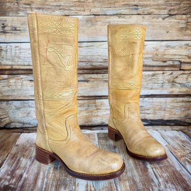 Good preowned condition with visible scuffs and surface marks. These have been thoroughly cleaned inside and out; some discoloration remains, particularly around the shaft collar. Soles and heels show some wear but are structurally strong with minimal actual use. Small indentation on back of left heel counter.
