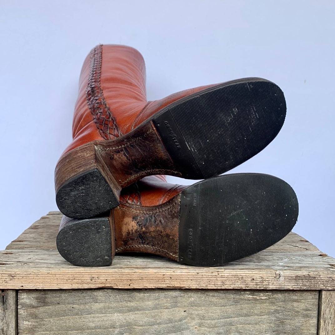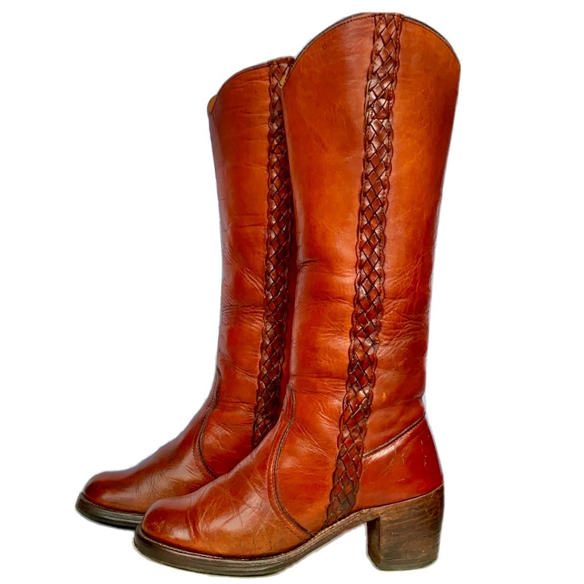 Just beauties. Original, True Vintage FRYE Black Label Braided Sabrina (Campus) Tall Knee High Brown Leather Boots