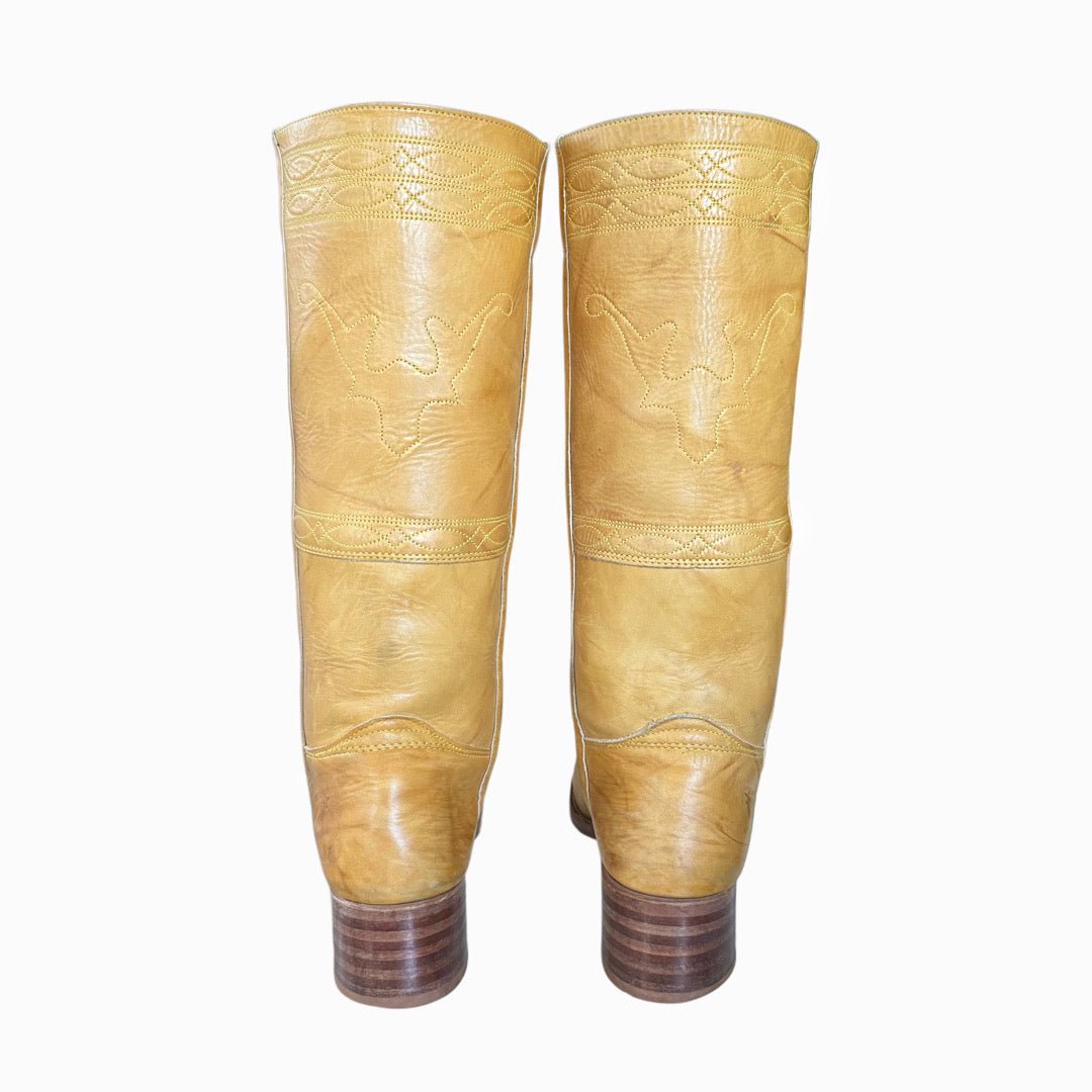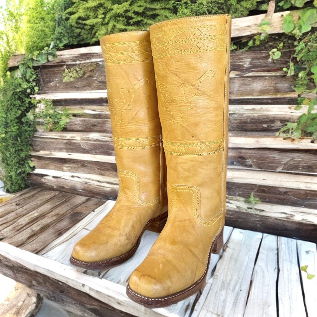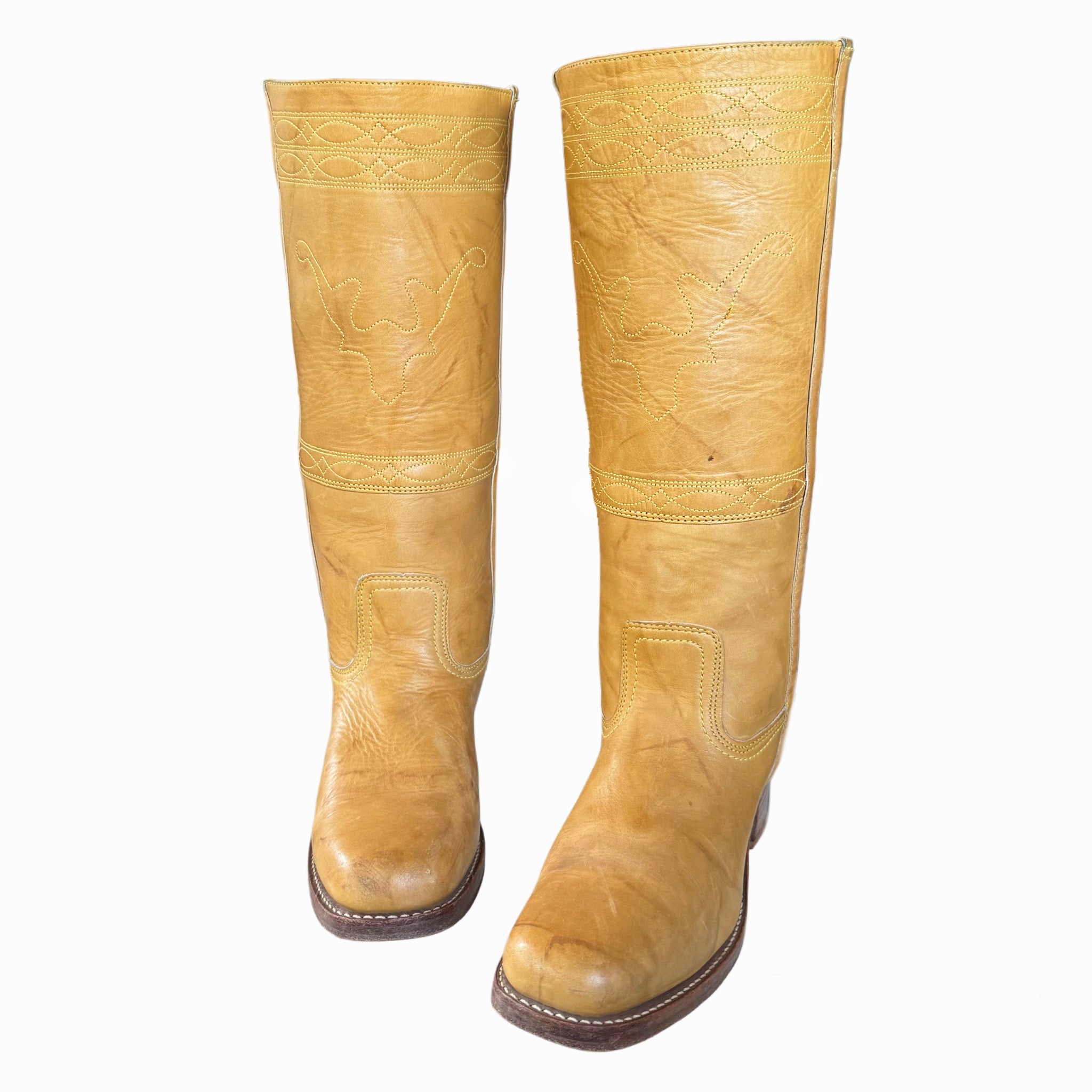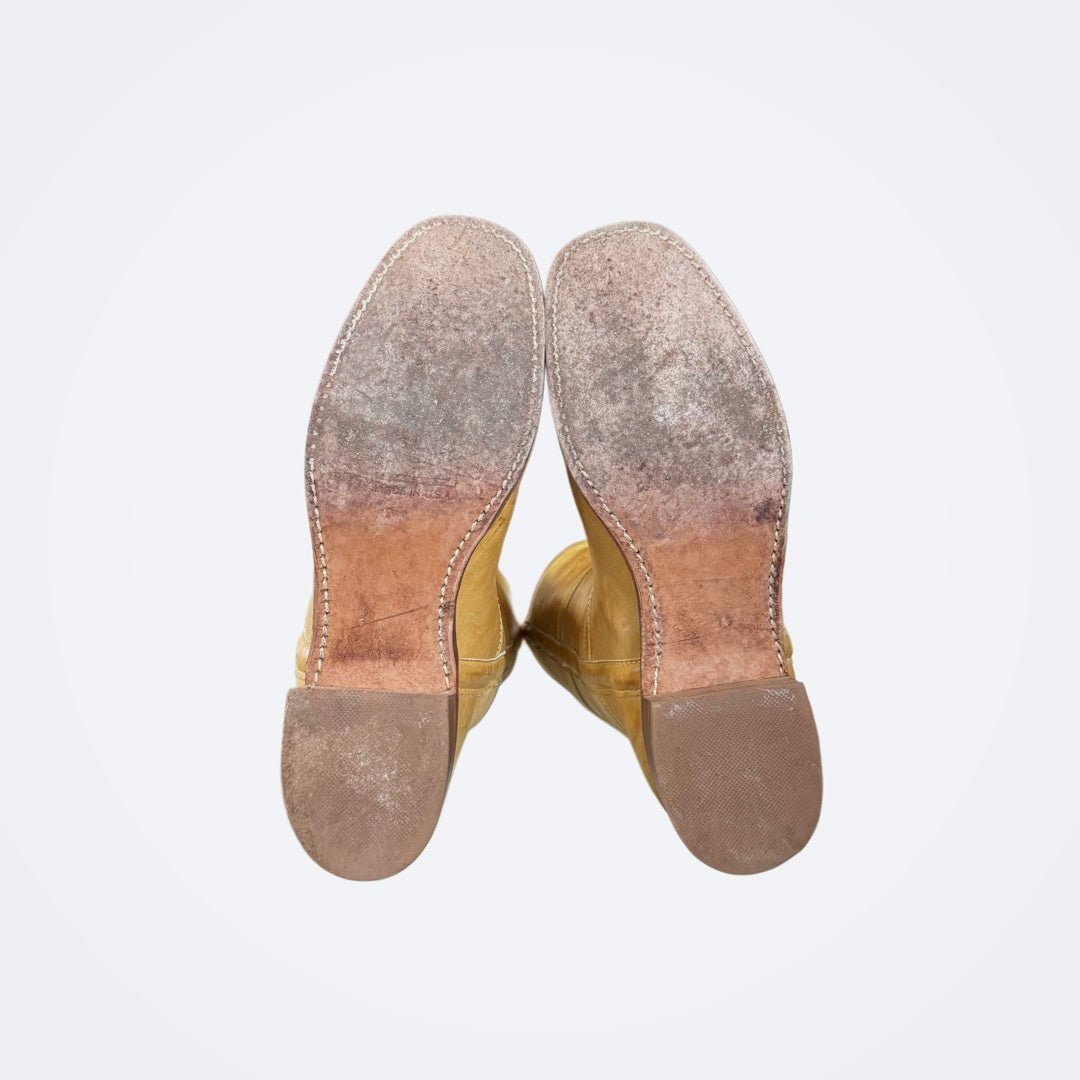 Rare find: Frye campus stitching horse knee-high western boots, in the ever sought after banana yellow leather. White label, white box series. Very difficult to find in these larger sizes, this banana color, and in this stellar condition. Today they remain a favorite in the Y2K trend scene, with their knee high height, chunky sole and heel, and wide square toe.