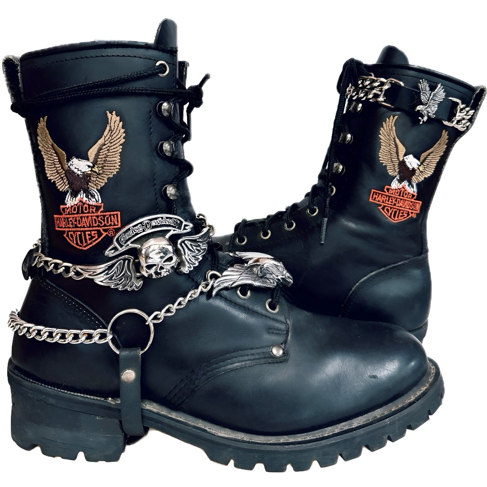 Vintage HARLEY-DAVIDSON Eagle Embroidered Lace Up Black Lug Sole Combat Moto Biker Boots