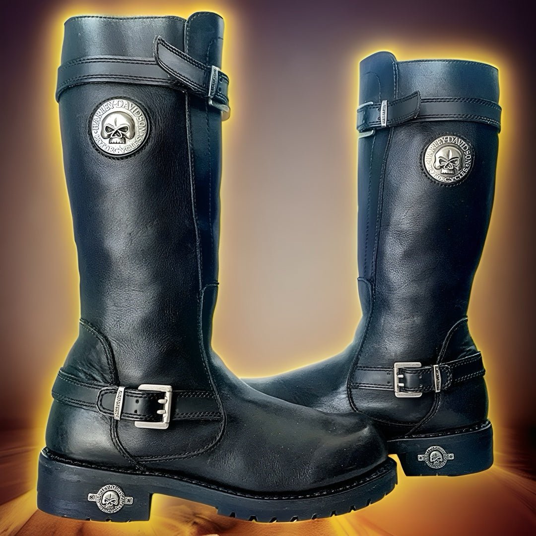 HARLEY-DAVIDSON Vintage Willie G Skull Tall Black Leather Biker Motorcycle Boots