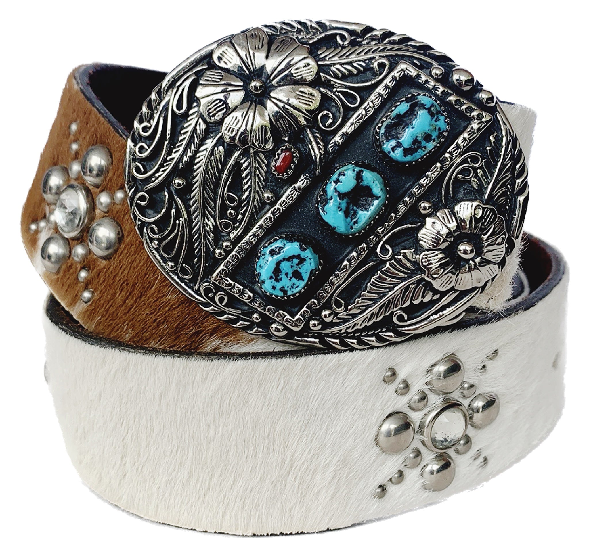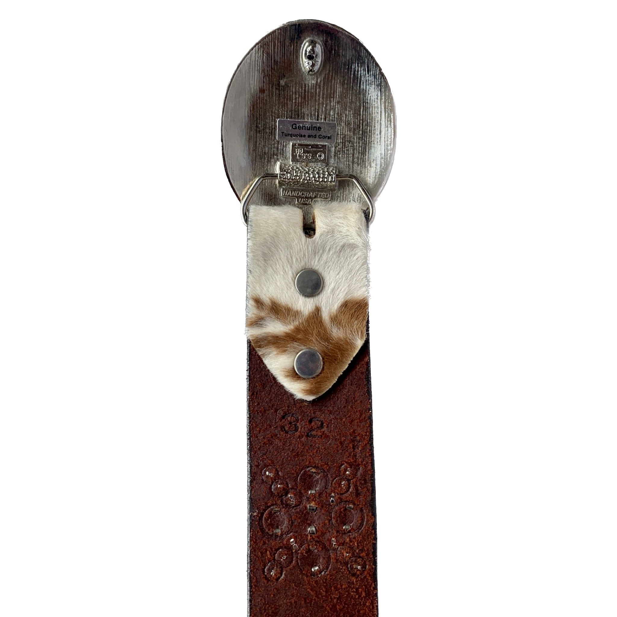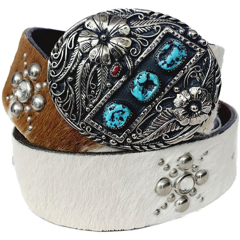 JO-ED Hair On Pony Western Belt, Handcrafted USA Silver Turquoise Coral Floral Buckle Set